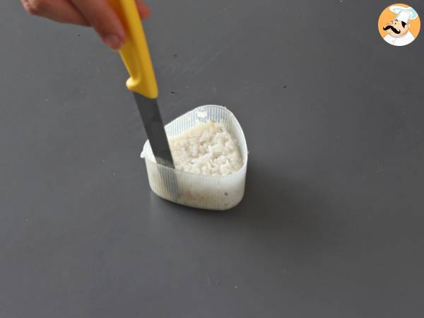 Abre el molde y retira los bordes del onigiri con un cuchillo.