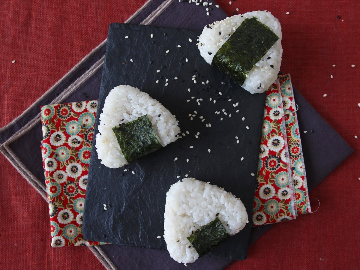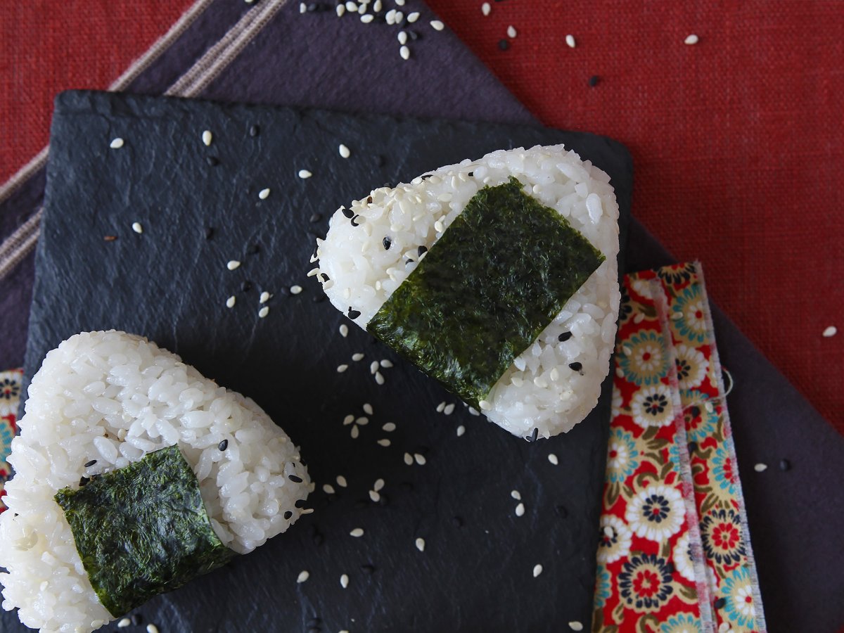 Puedes cortar las algas en tiras y colocarlas alrededor del arroz como se muestra aquí, o cortar un rectángulo grande del ancho del onigiri y envolverlo todo alrededor antes de comer el bocadillo para que conserve su textura crujiente.