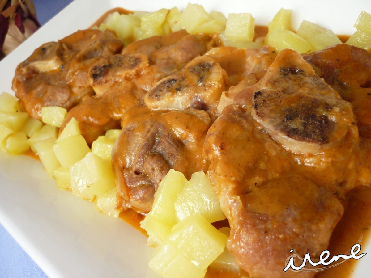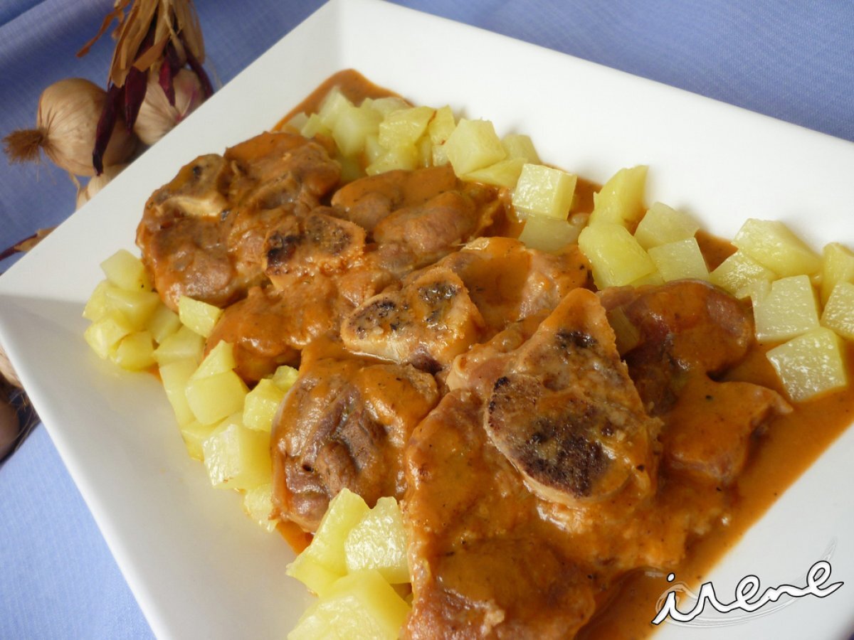 Osobuco en salsa AnteriorSiguiente PlatoMedio55 min816 Kcal Enviar esta receta a un amigo Imprimir esta página Preguntar al autor Publicar la foto de esta receta Ingredientes 4 8 osobucos de cerdo 2 cebollas 1/2 puerro 2 tomates maduritos 2 zanahorias 2 dientes de ajo Un vaso de vino blanco de jerez Dos vasos de agua o caldo de carne Aceite Sal Pimienta Harina Patatas para la guarnición Costo estimado: 8.43Euros€ (2.11€/porción)