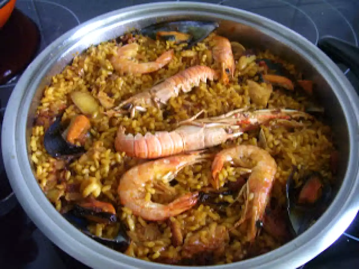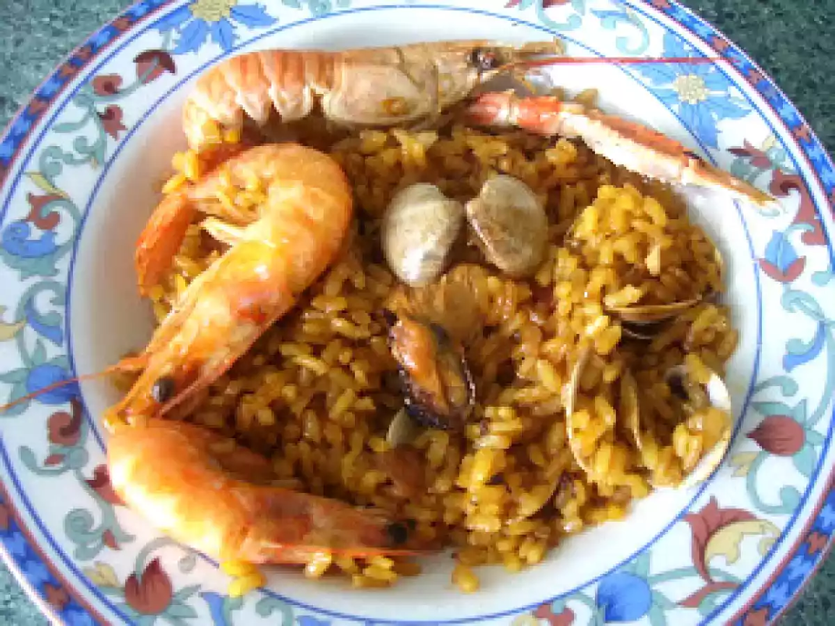 Paella de marisco AnteriorSiguiente PlatoFácil30 min Enviar esta receta a un amigo Imprimir esta página Preguntar al autor Publicar la foto de esta receta No olvidar el zumo de limón. Ingredientes 2 200 g de arroz 1 sepia pequeña 100 g de chirlas 6 mejillones 4 langostinos 2 cigalas caldo de pescado Cebolla 1 tomate maduro 1 diente de ajo perejil unas hebras de azafrán sal aceite de oliva