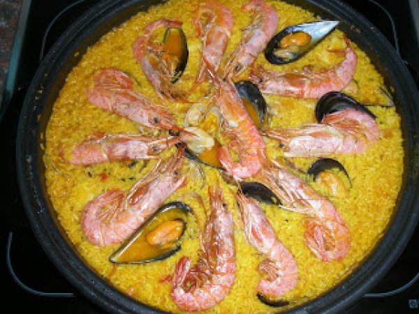 Paella PlatoFácil1 h 20 m Enviar esta receta a un amigo Imprimir esta página Preguntar al autor Publicar la foto de esta receta Ingredientes 9 3 tazas de las de desayuno de arroz 300 g de almejas 1/2 kg de mejillones Dos colas pequeñas de rape 200 g de pota o calamar 12 gambas o langostinos Un bote de sofrito de tomate sal, azafran y pimentón dulce al gusto 2,5 l de caldo de pescado