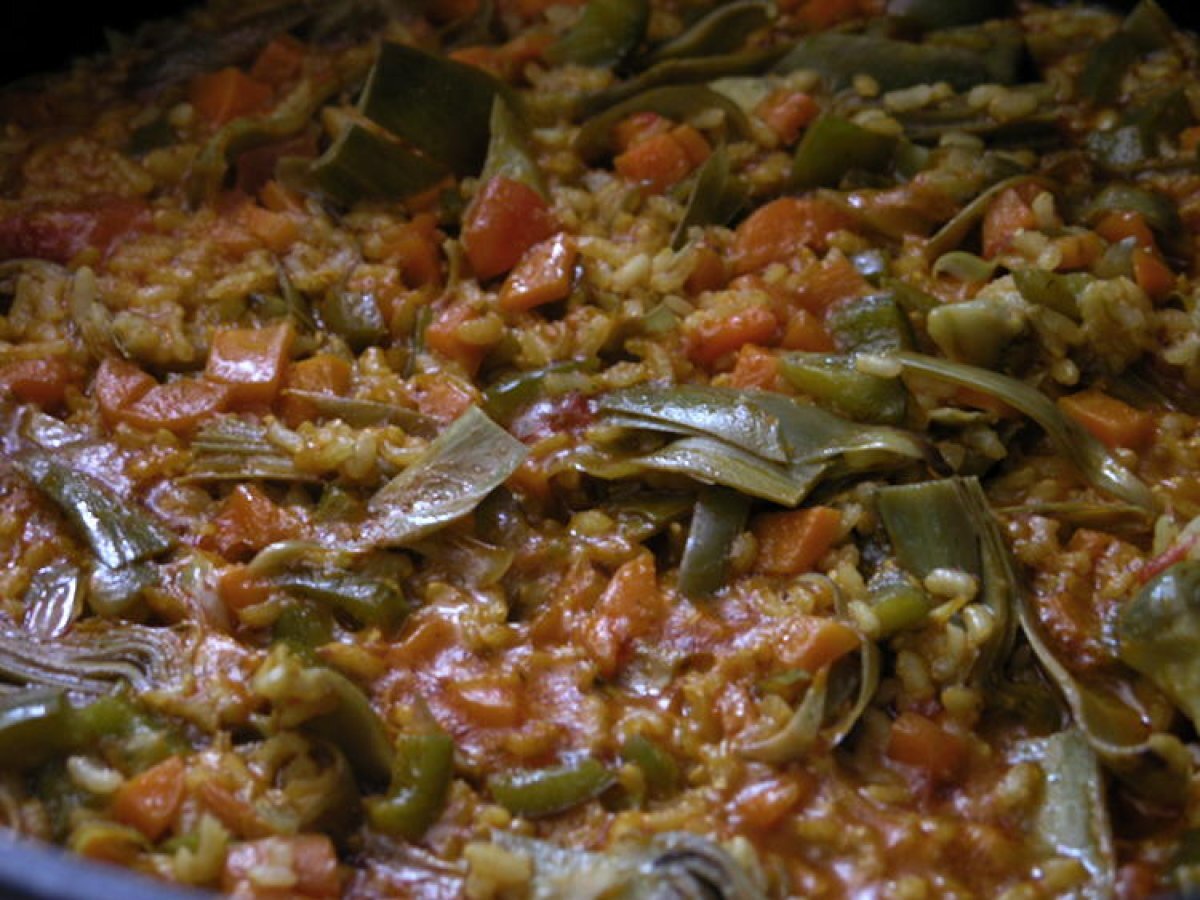 Paella vegetal amb arrós integral PlatoMedio50 min Enviar esta receta a un amigo Imprimir esta página Preguntar al autor Publicar la foto de esta receta Ingredientes 2 2 pastanagues 1 pebrot verd 1 tomàquet 3 carxofes 12 tasses caldo vegetal 1 picada feta amb ametlles, avellanes, pinyons, 2 culleradetes de polpa de nyora, 2 dents d’all, julivert, 1 cullerada d‘oli d’oliva i 4 cullerades d’aigua 4 tasses d’arrós semi integral