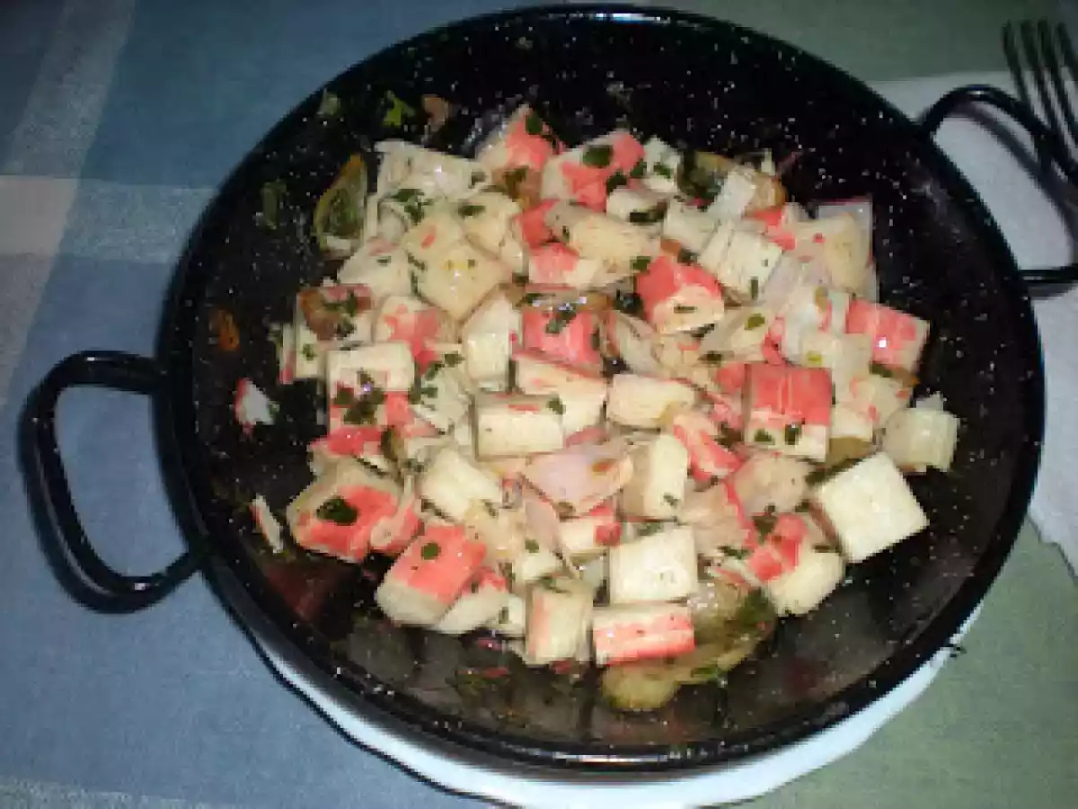 Palitos de cangrejo al ajo y perejil PlatoMedio25 min381 Kcal Enviar esta receta a un amigo Imprimir esta página Preguntar al autor Publicar la foto de esta receta Ingredientes 1 200 gramos de palitos de cangrejo 3 dietes de ajos laminados 1 cuchara de aceite oliva 1 cucharadita de perejil 4 cucharas de agua 1 toque de picante