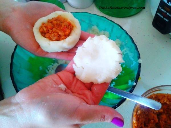 Transcurrido el tiempo prudencial, con ayuda de una cuchara sopera coge primero una cantidad suficiente para hacer una bola y moldear de manera que dejemos un hoyo en el centro para poner una cucharadita y algo más de picadillo, según el tamaño de la papa.