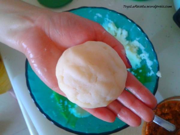 Con la otra mano coge un poco más de puré aplástalo un poco con los mismos dedos, de forma que hagas una circunferencia con la que tapes y formes una bola completa. No te preocupes si no te quedó a la primera muy redondeada. Después coge mejor forma.