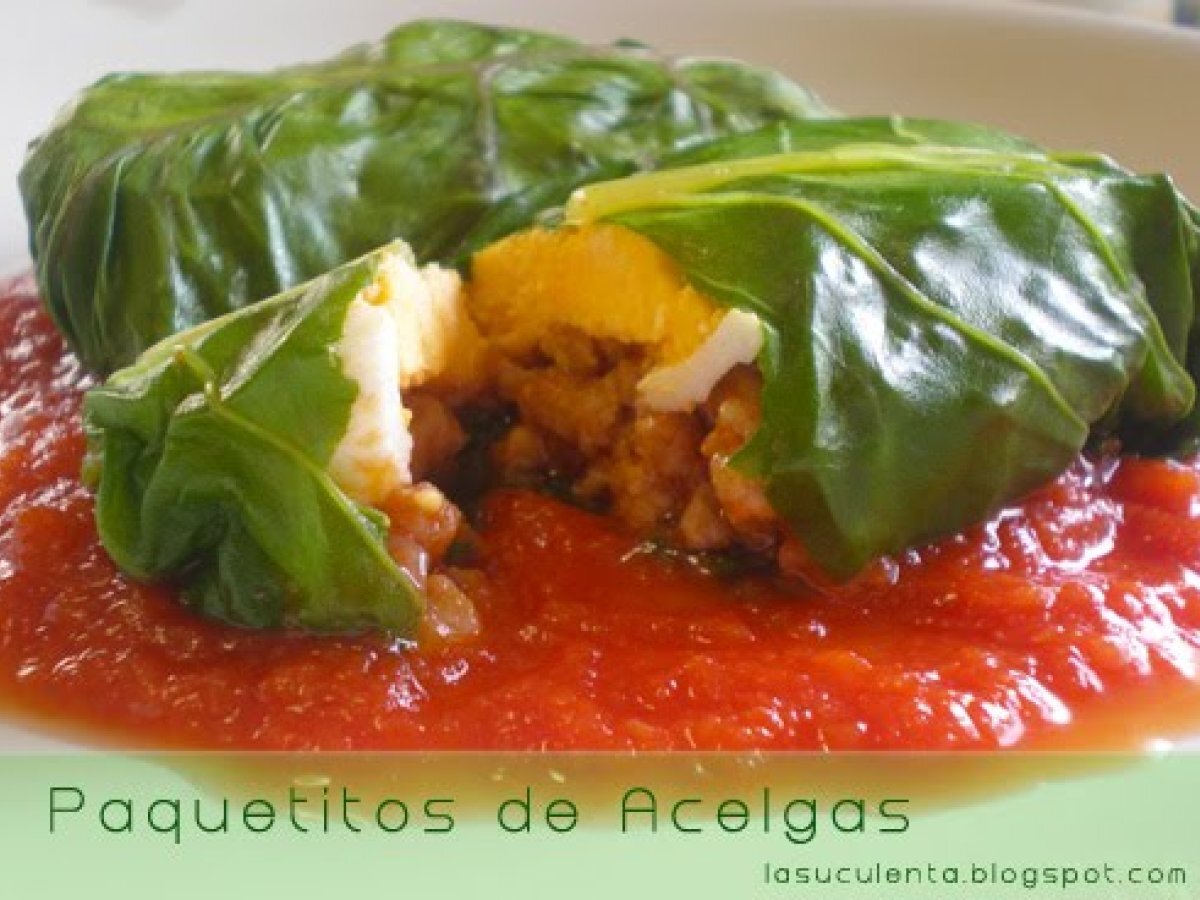 Paquetitos de acelgas rellenos AnteriorSiguiente PlatoFácil35 min502 Kcal Enviar esta receta a un amigo Imprimir esta página Preguntar al autor Publicar la foto de esta receta Una forma original de comer acelgas. Ingredientes 2 4 hojas de acelgas 2 huevos cocidos 250 gr de carne picada tomate frito casero jamón serrano en taquitos 1 cebolleta 1 ajo aceite de oliva perejil sal pimienta Costo estimado: 5.81Euros€ (2.91€/porción)