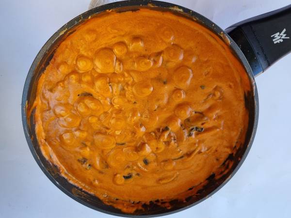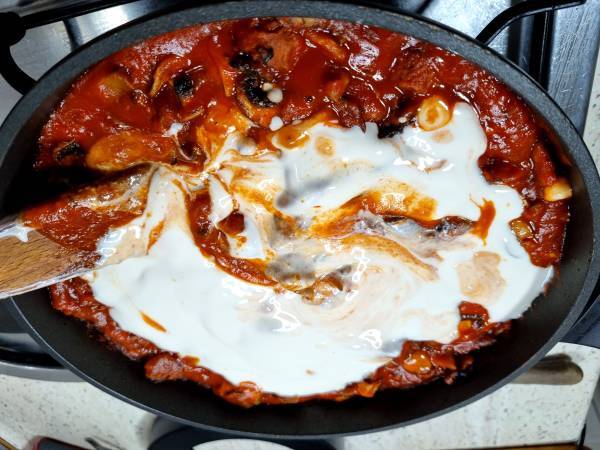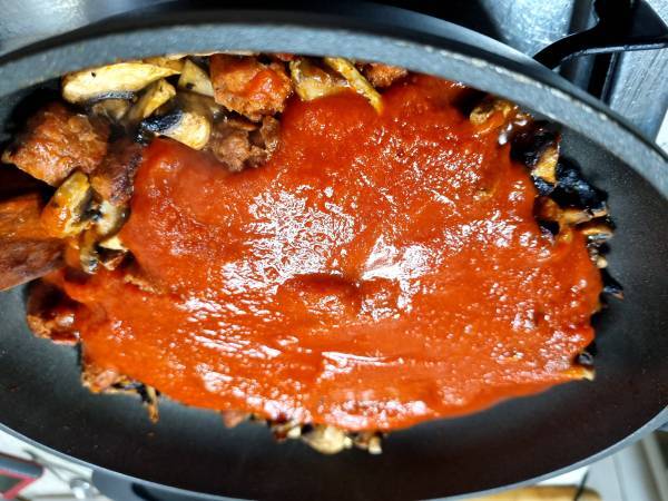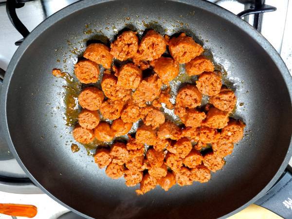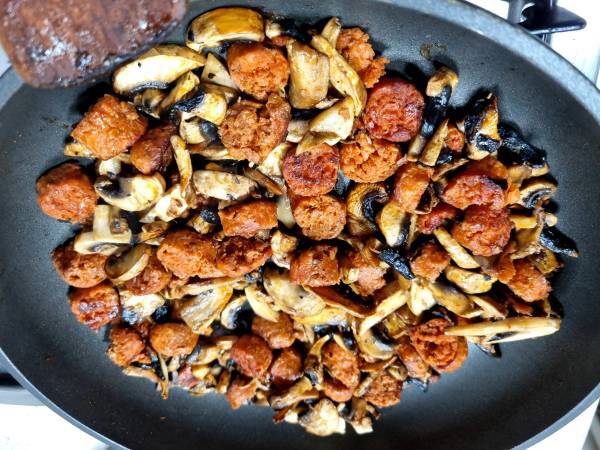 He preparado esta receta en versión vegana para reducir mi problema de colesterol y ya me he venido arriba y también la he preparado sin gluten. No soy vegana pero me llaman mucho la atención las recetas veganas, no se porqué. Las sigo principalmente para no tomar grasa animal y reducir mi colesterol. La idea era hacer una pasta como los rigatoni al forno del restaurante Ginos. Yo no encontré rigatoni sin gluten pero esta pasta va muy bien también. En fin, es una versión muy muy libre. Me apetecía mucho utilizar algo de la marca Heura. Cada vez que voy al super me quedo un buen rato mirando todas las variedades de productos veganos, es casi un ritual. Luego veo los precios y me voy resignada a otros pasillos. Pero esta vez me decidí y el chorizo ha sido el elegido. Tiene una textura muy diferente. Se desmorona mucho al cortarlo en rodajas. Pero el sabor y el olor es fantástico, a pesar de que no sabe a chorizo pero aún así está bastante rico.