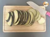 En el horno: Hornee la berenjena cortada en rodajas de 0,5 cm durante 20 a 25 minutos a 180°C, en una o más bandejas para hornear cubiertas con papel pergamino.