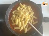 Escurre la pasta y échala inmediatamente a la sartén con la salsa de tomate. Termina de cocinar la pasta en la salsa.