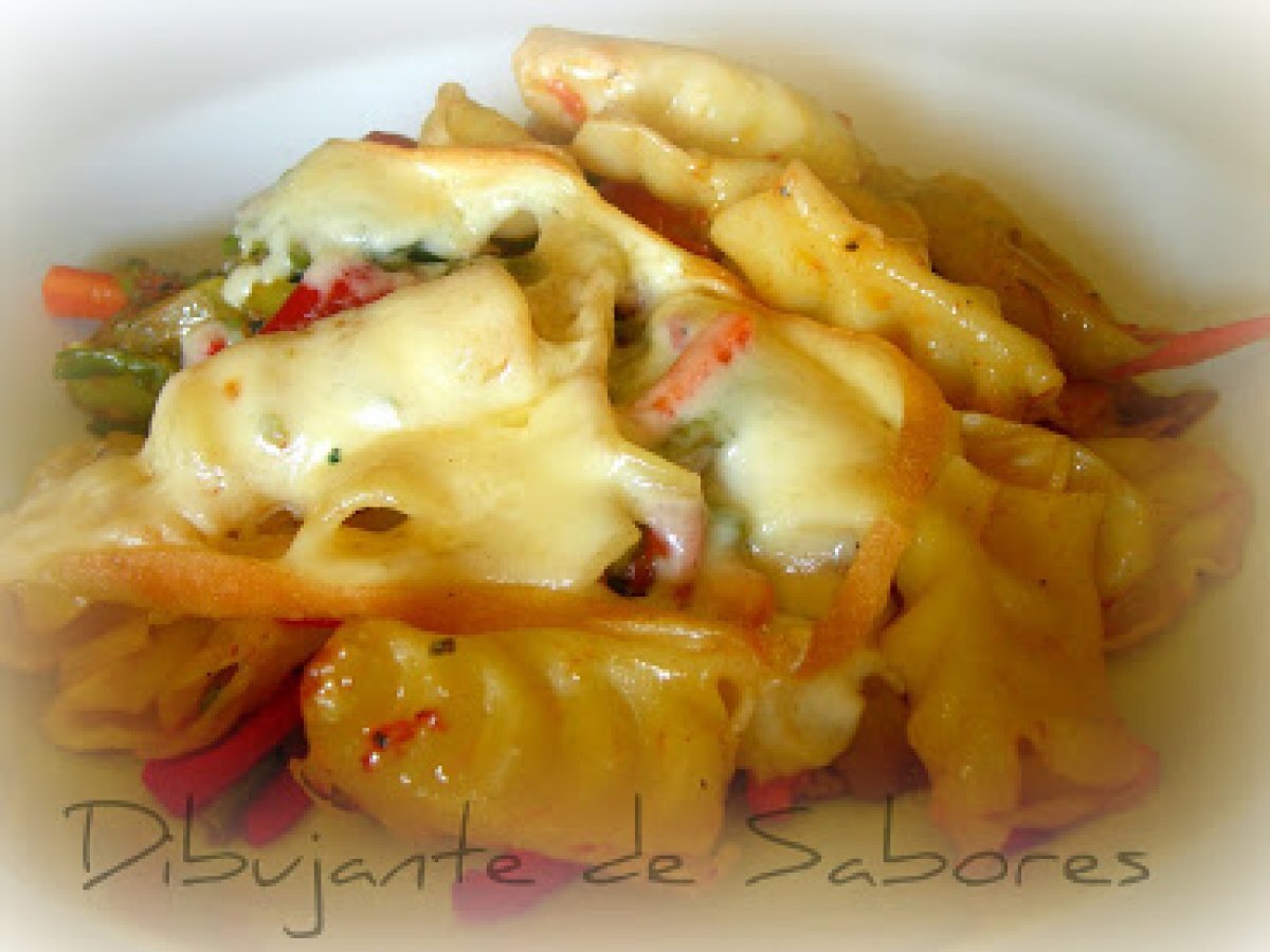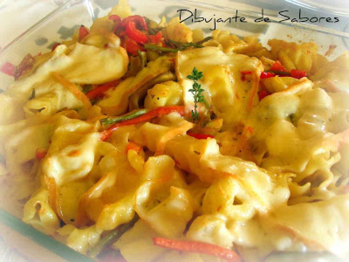 Pasta festonati vegatariana gratinada con queso raclette. AnteriorSiguiente PlatoFácil55 min773 Kcal Enviar esta receta a un amigo Imprimir esta página Preguntar al autor Publicar la foto de esta receta Ingredientes 4 500 g de pasta 1 berenjena 1 calabacín 1 cebolla 1 pimiento rojo 1 manojo de espárragos trigueros 2 tomates 2 zanahorias 250 g de queso raclette aceite de oliva sal pimienta pimentón tomillo fresco romero fresco garam masala canela