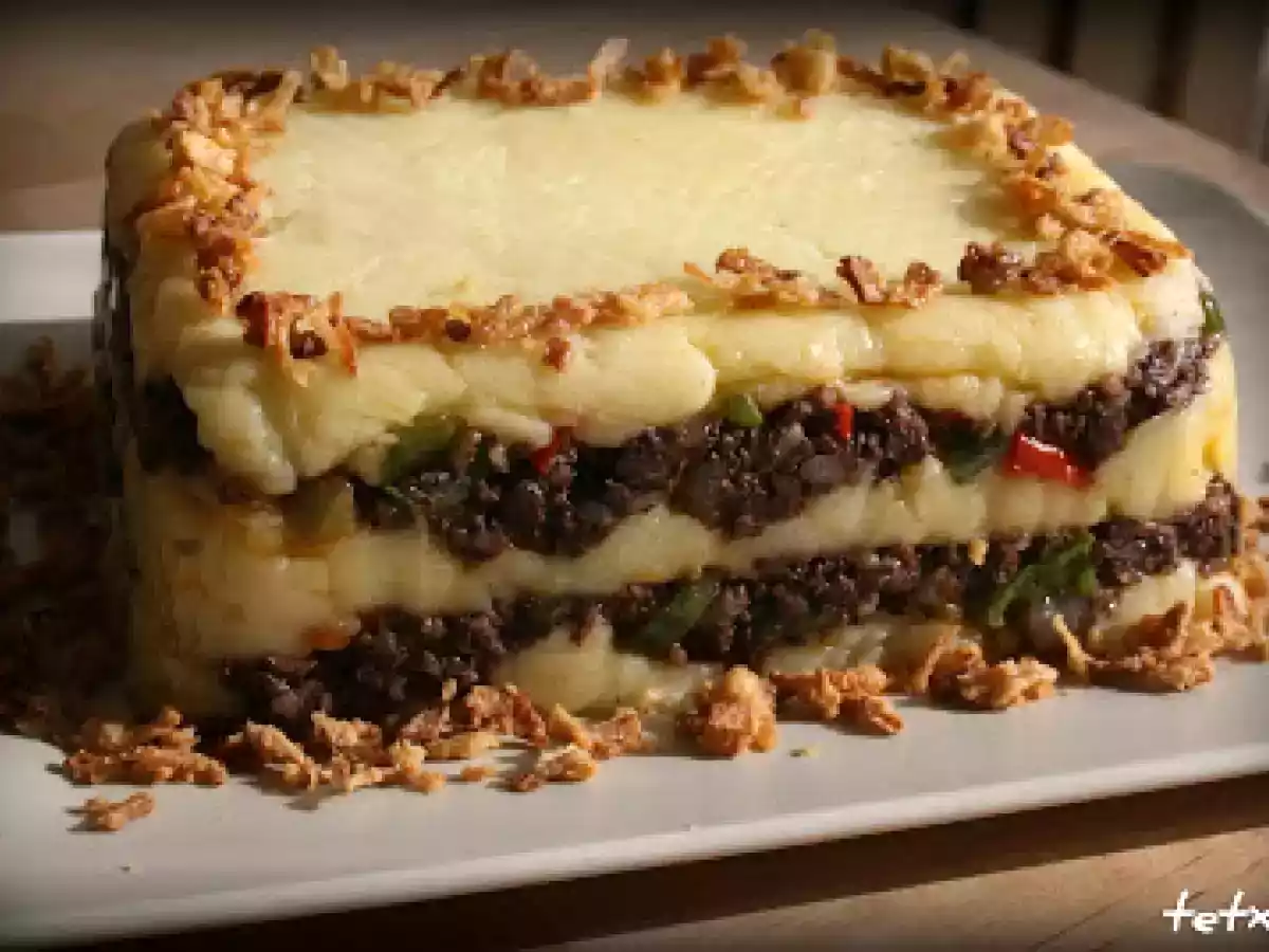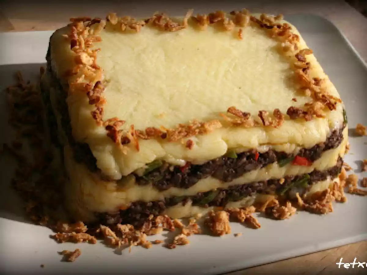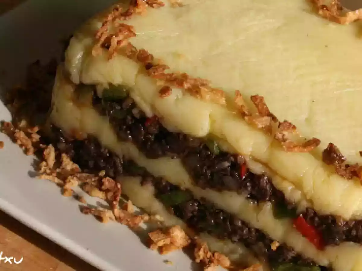 Pastel o lasaña sin pasta de morcilla (fussioncook) AnteriorSiguiente PlatoFácil1 hora651 Kcal Enviar esta receta a un amigo Imprimir esta página Preguntar al autor Publicar la foto de esta receta Ingredientes 2 600 g de patatas 25 ml de agua 100 ml de leche sal 20 g de mantequilla 1 morcilla de arroz grande 50 g de pimiento rojo 50 g de pimiento verde 80 g de cebolla 2 cucharas soperas de tomate frito. pizca de sal aceite Costo estimado: 1.86Euros€ (0.93€/porción)