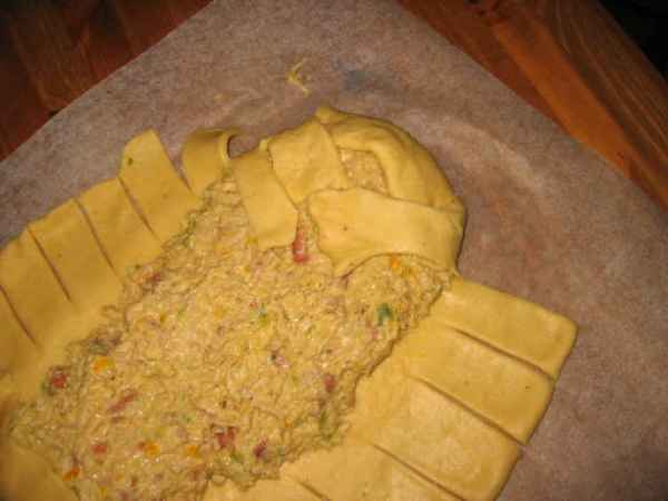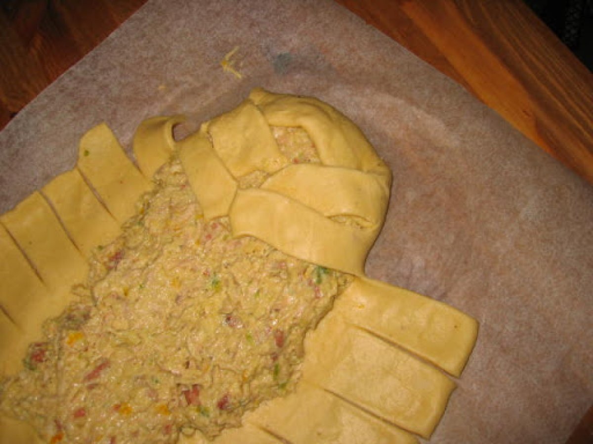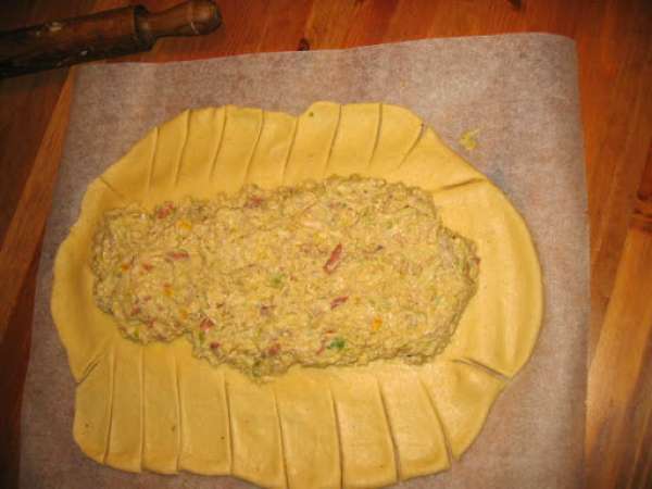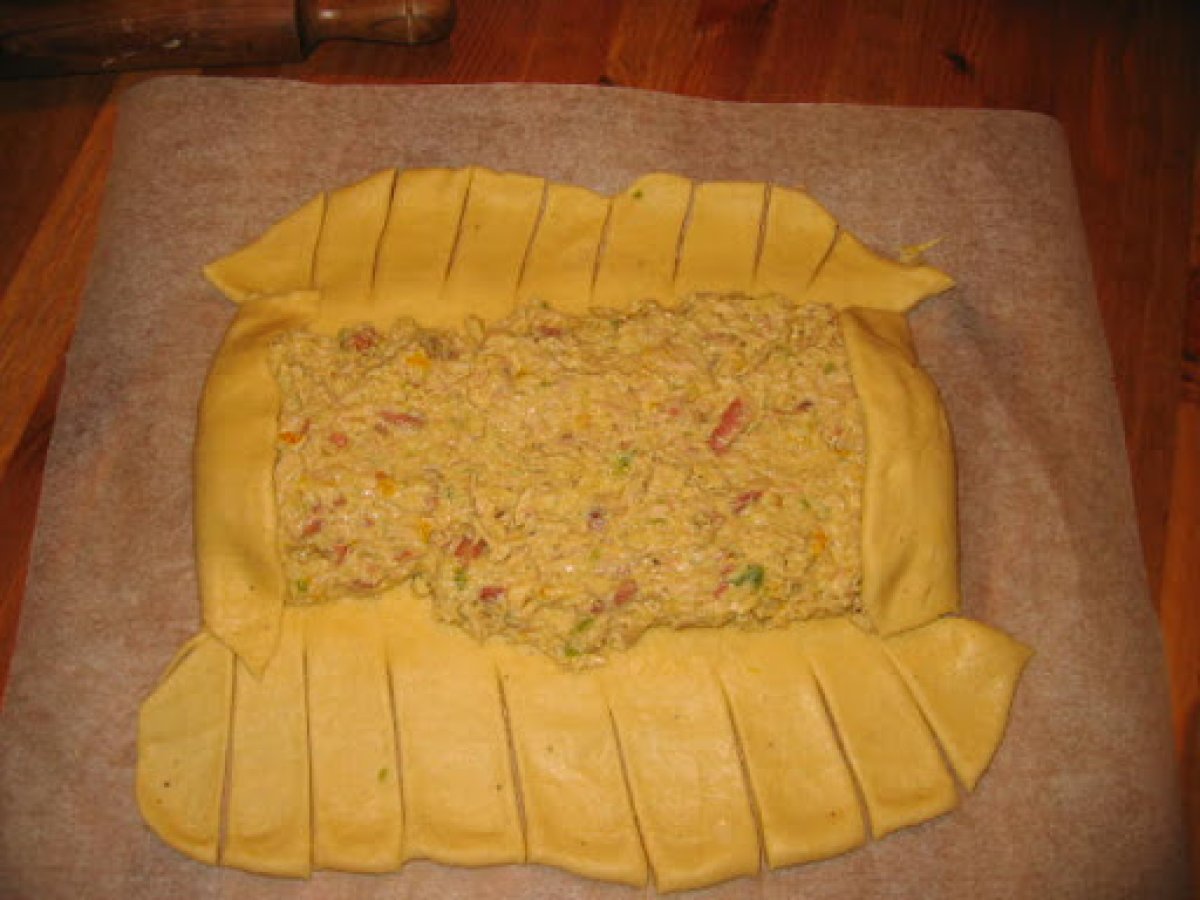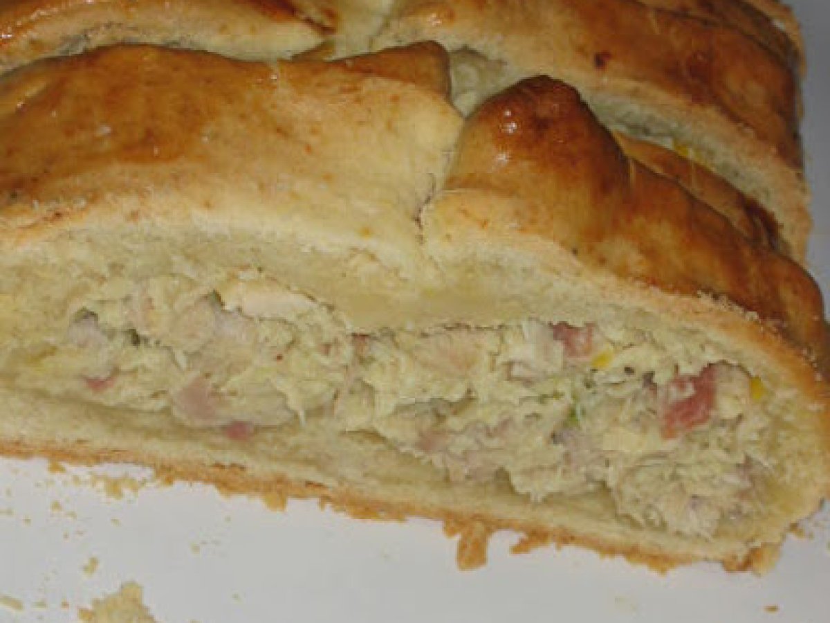 Pastel trenzado de pollo AnteriorSiguiente PlatoFácil40 min Enviar esta receta a un amigo Imprimir esta página Preguntar al autor Publicar la foto de esta receta He aquí una nueva receta de sándwich. Ingredientes 4 75 g de harina 1 cdita colmada de polvo para hornear 1/2 cdita sal 50 g de mantequilla fria 2 huevos 1 y 1/2 cda de aceite 100 cc de leche fria