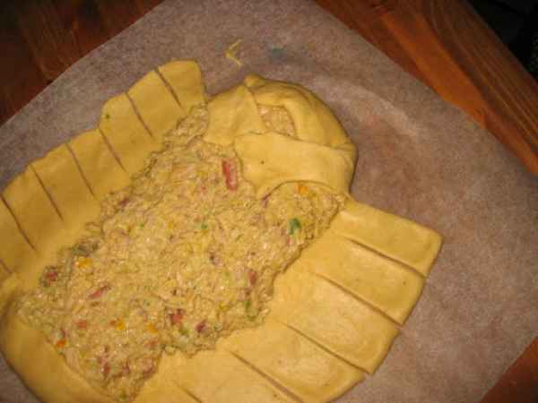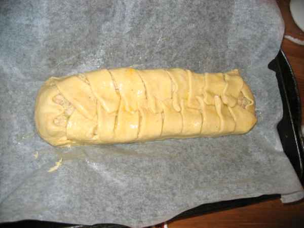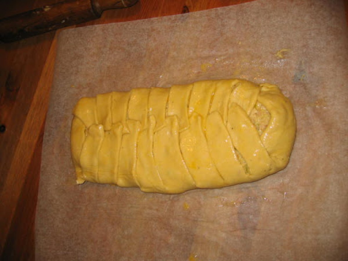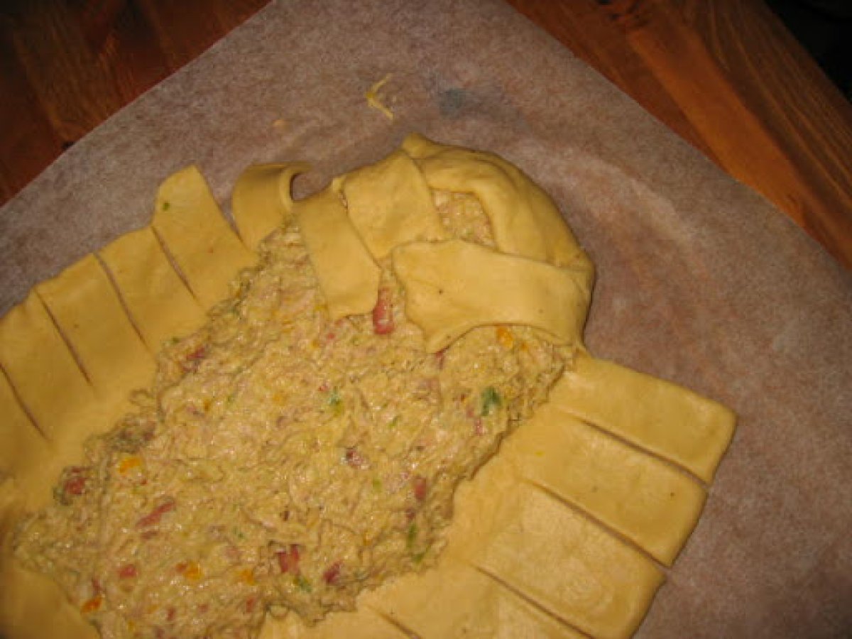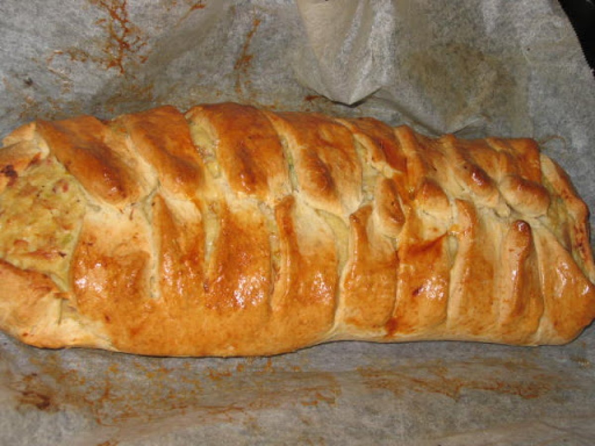 Pastel trenzado de pollo AnteriorSiguiente PlatoFácil40 min Enviar esta receta a un amigo Imprimir esta página Preguntar al autor Publicar la foto de esta receta He aquí una nueva receta de sándwich. Ingredientes 4 75 g de harina 1 cdita colmada de polvo para hornear 1/2 cdita sal 50 g de mantequilla fria 2 huevos 1 y 1/2 cda de aceite 100 cc de leche fria