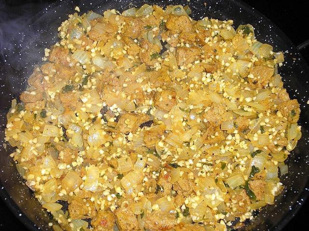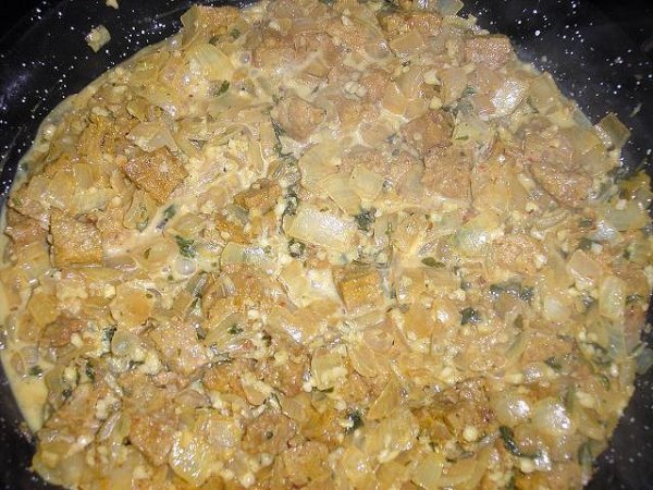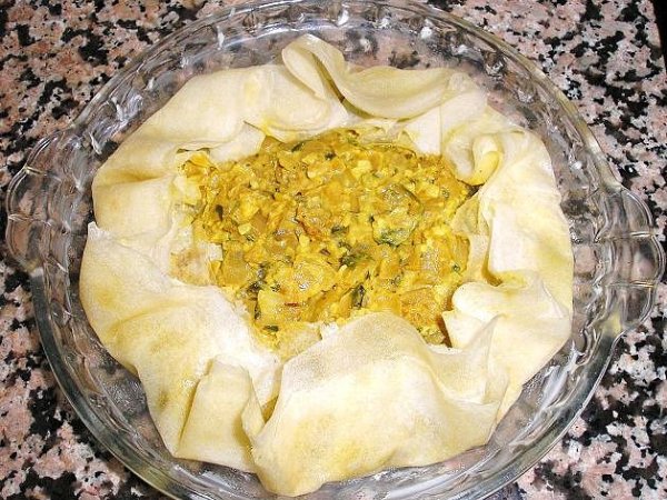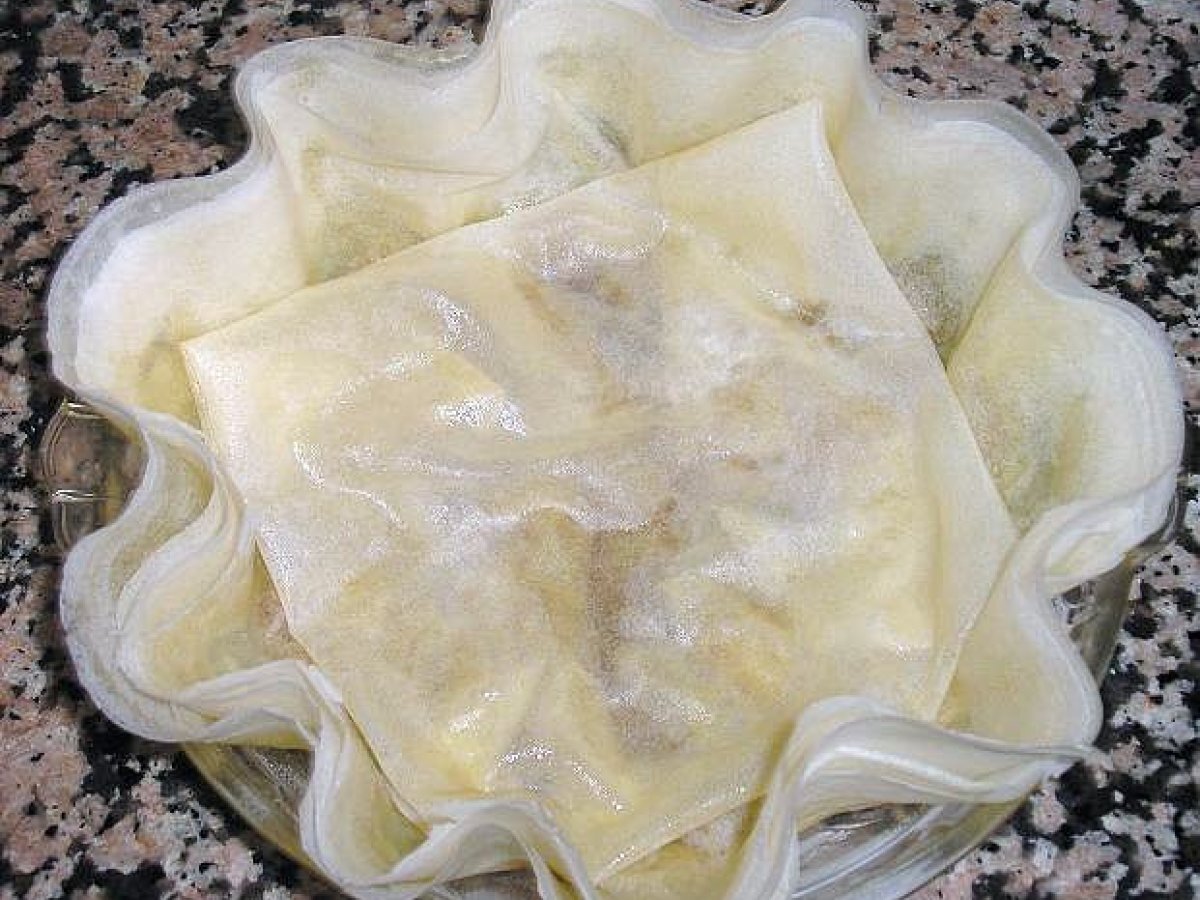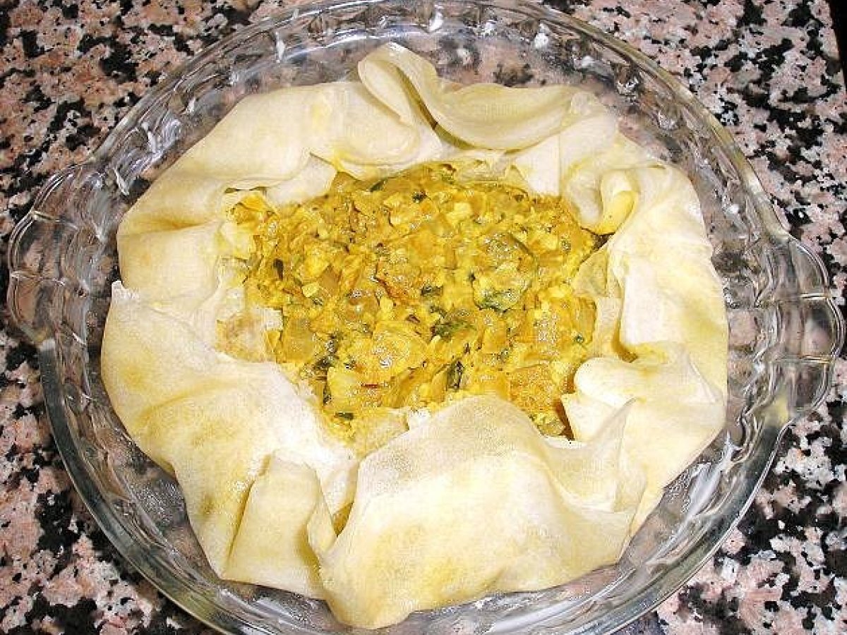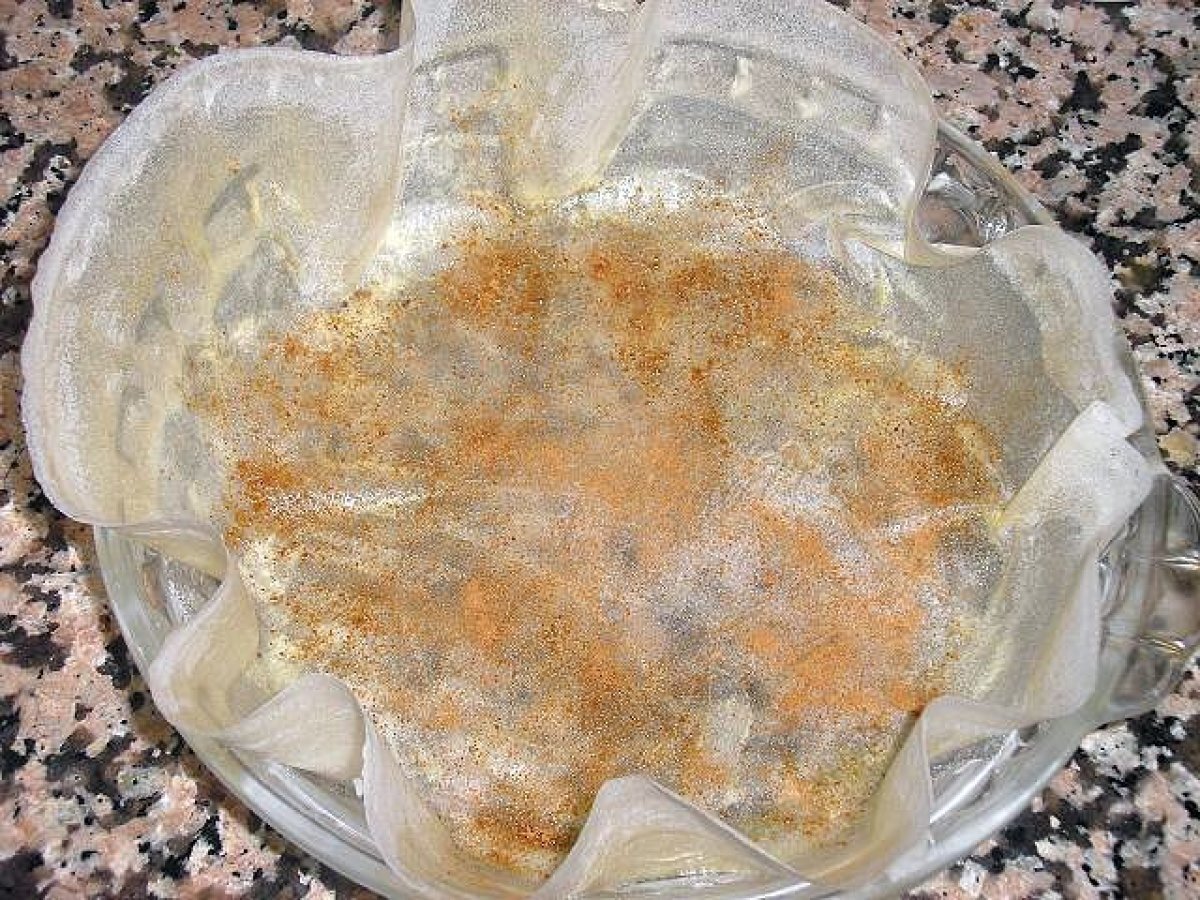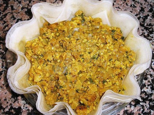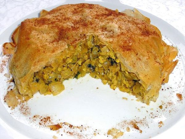 Pastilla o bastela ( adaptación vegana) AnteriorSiguiente PlatoFácil1 hora Enviar esta receta a un amigo Imprimir esta página Preguntar al autor Publicar la foto de esta receta Un bonito ingreso delicioso para almorzarlo. Ingredientes 4 150 g de seitán. 8-10 hojas de pasta brik o filo ( he usado 8). 3 cebollas medianas. 4 cucharadas soperas colmadas de almendra cruda troceada ( tipo granillo). 3 cucharadas soperas de aceite de oliva. 3 cucharadas soperas de margarina vegetal ( si se puede no hidrogenada ) y un poco más para untar el molde. 10-12 ramas de cilantro fresco o de perejil. Un poco menos de 1/2 vaso de leche vegetal al gusto ( he usado leche de soja). Las especias y condimentos: 1 cdta de cúrcuma. Una pizca de jengibre molido. Una pizca de nuez moscada recién molida. Pimienta negra recién molida. Sal. 1 cdta de canela molida. 2 cucharadas soperas de azúcar integral.