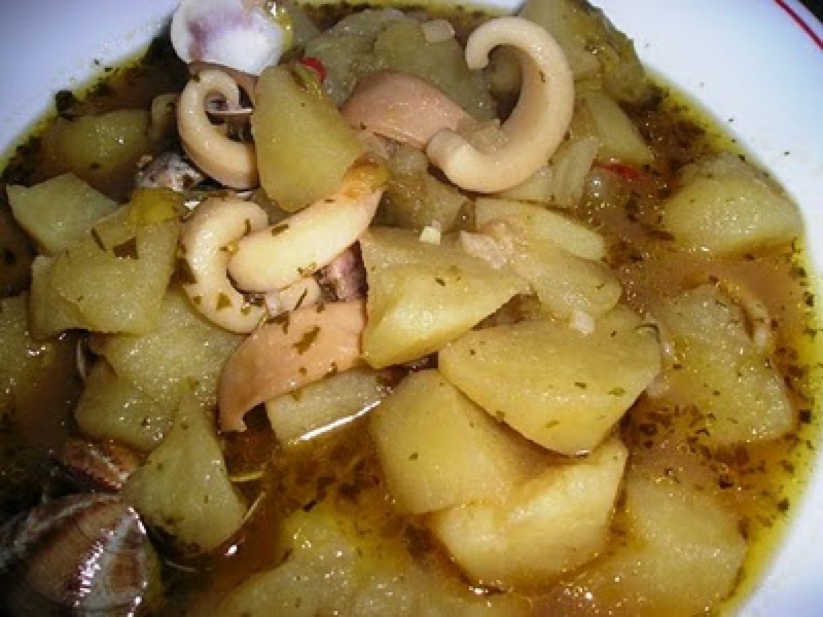 Patatas a la marinera "con toques de enamorada " PlatoFácil35 min Enviar esta receta a un amigo Imprimir esta página Preguntar al autor Publicar la foto de esta receta Ingredientes 2 4 Patatas medianas 1 Puerro 1 ajo Chorrito de Finas Hierbas 4 Picos de calamar un puñadito de chirlas 1 pimiento de piquillo aceite y sal Caldo de pescado