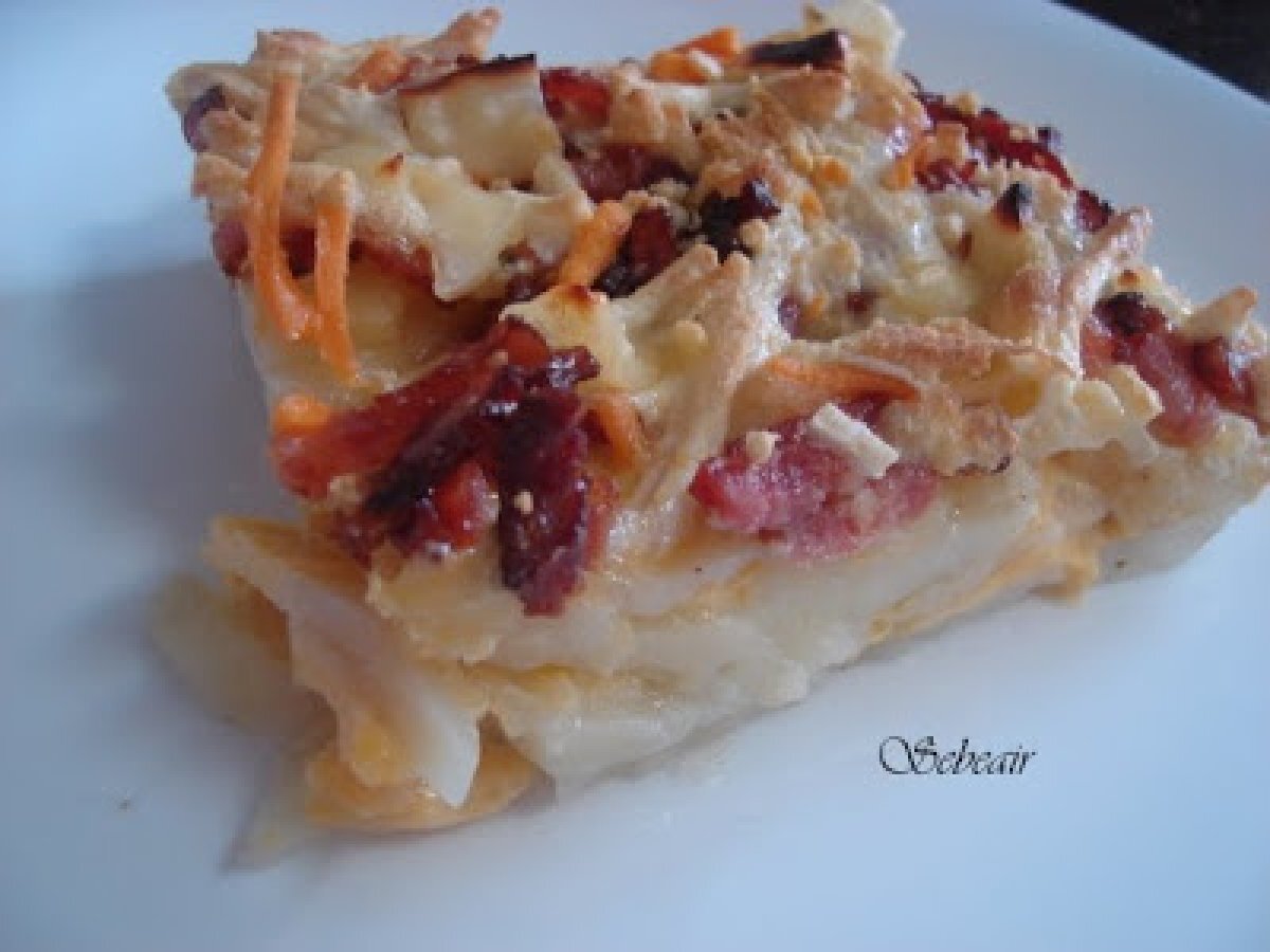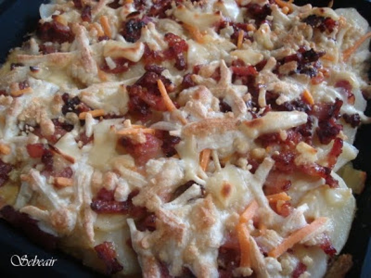 Patatas gratinadas (fussioncook y horno) AnteriorSiguiente PlatoFácil50 min277 Kcal Enviar esta receta a un amigo Imprimir esta página Preguntar al autor Publicar la foto de esta receta Ingredientes 4 4 patatas grandes cortadas finas como para tortilla 3 huevos XL 1 tarrina de bacon picado Queso rallado Sal pimienta y aceite de oliva Costo estimado: 1.93Euros€ (0.48€/porción)