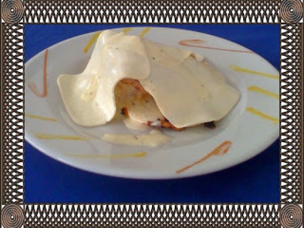 Pechuga de pollo rellena de camarones en salsa de estragon + cubierta de queso paisa