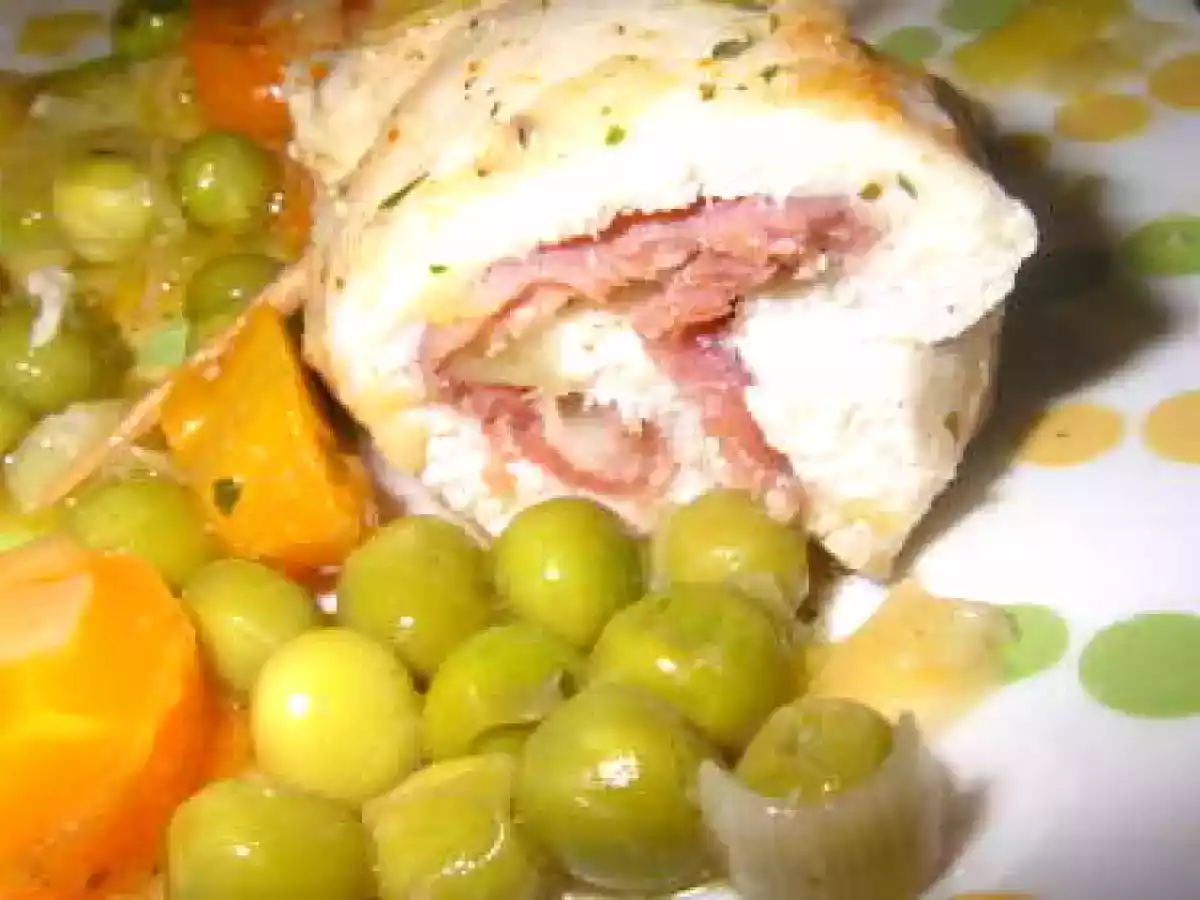 Pechugas rellenas de jamón serrano. AnteriorSiguiente PlatoMedio1 hora Enviar esta receta a un amigo Imprimir esta página Preguntar al autor Publicar la foto de esta receta Ingredientes 1 6 filetes de pechuga de pollo 6 lonchas de jamón serrano 6 lonchas de queso 2 dientes de ajo 1 puerro guisantes 200ml. de vino blanco 1/2 vaso de agua 1 zanahoria grande perejil picado pimienta harina sal, aceite de oliva y palillos.