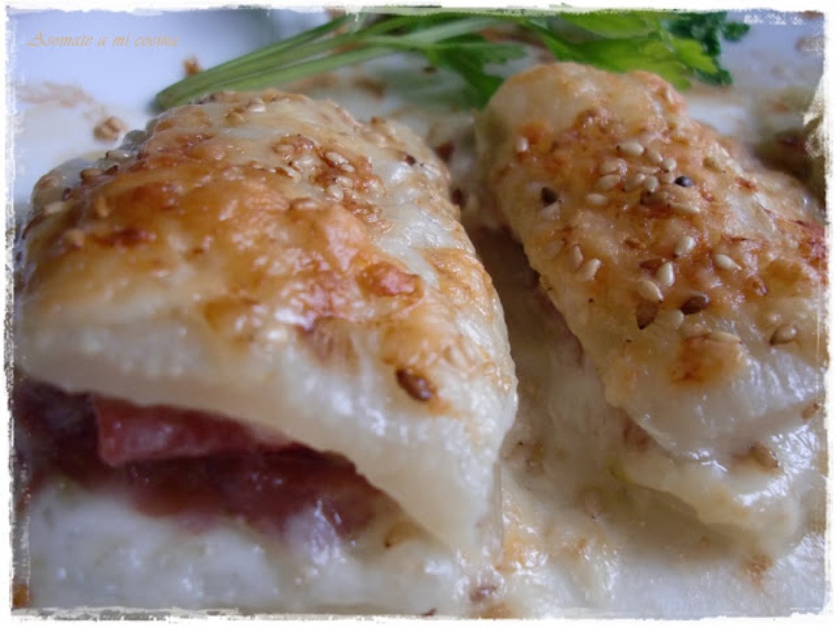 Pencas de acelga gratinadas AnteriorSiguiente PlatoFácil30 min Enviar esta receta a un amigo Imprimir esta página Preguntar al autor Publicar la foto de esta receta Ingredientes 2 pencas de acelga lonchas de jamón serrano muy finas queso curado semillas de sésamo
