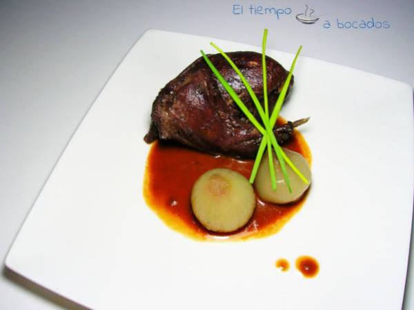 Presentamos la perdiz y cubrimos con la salsa. Adornamos también con las cebollitas. Finalizamos la presentación con unas tiras de hoja de puerro.