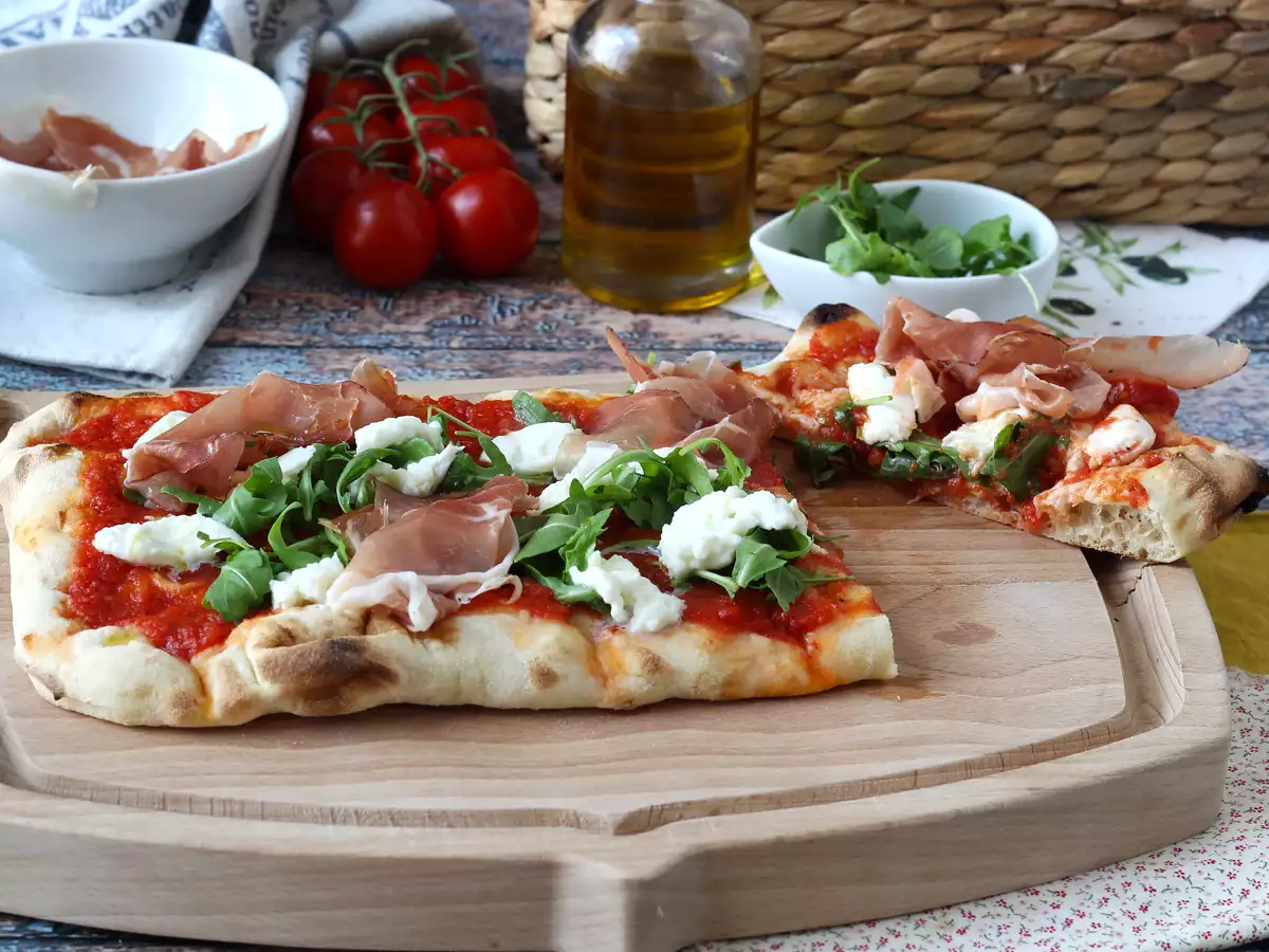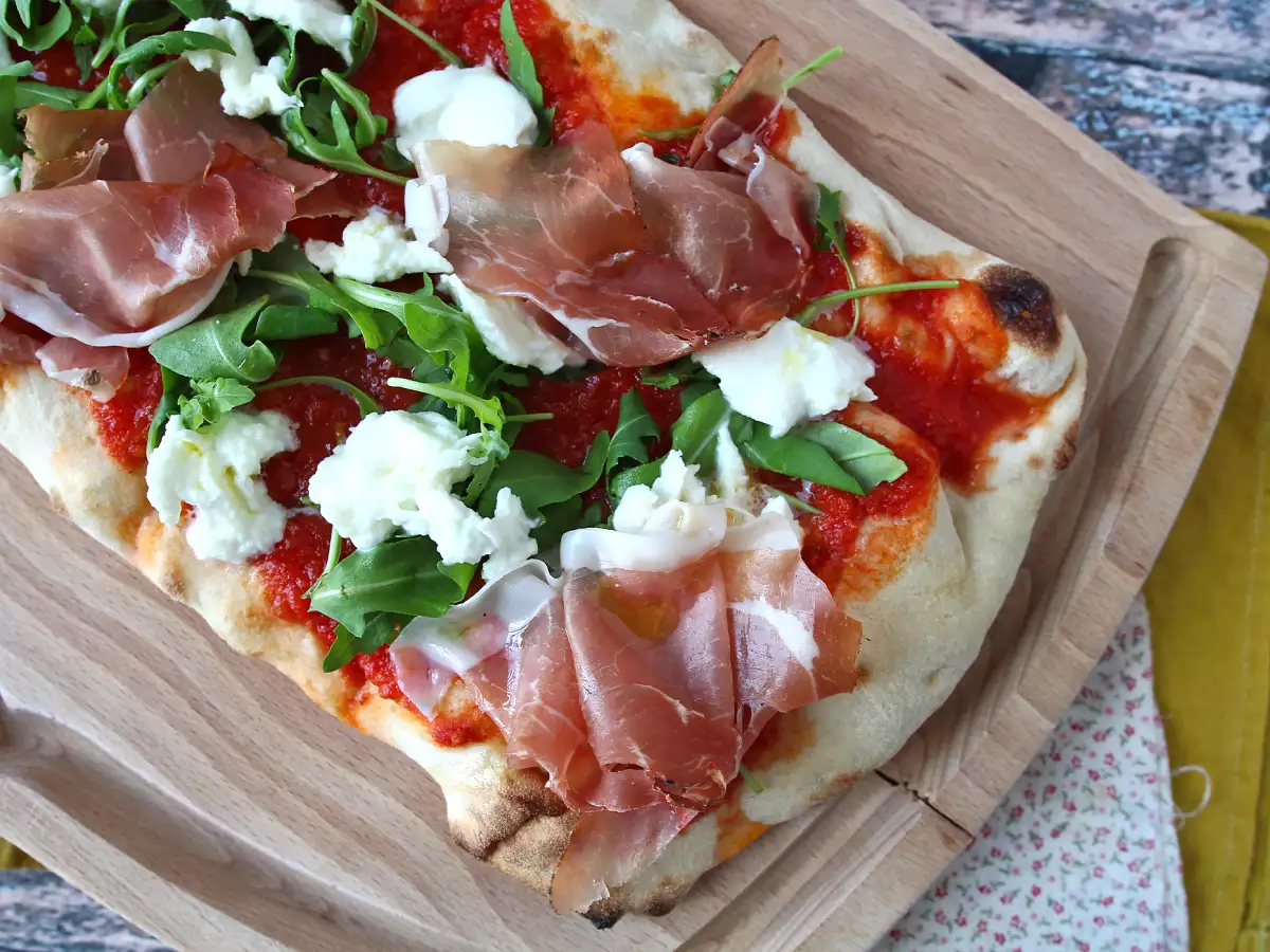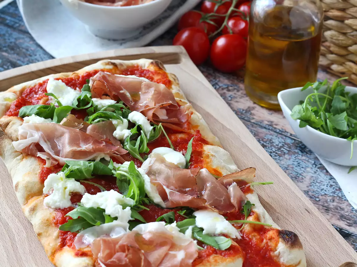 Elige una mozzarella fresca, un jamón serrano de calidad, tomates pelados al natural y rúcula fresca para lograr un equilibrio perfecto entre suavidad, salado y frescor. También puedes añadir unos piñones tostados si te apetece dar un toque crujiente.
