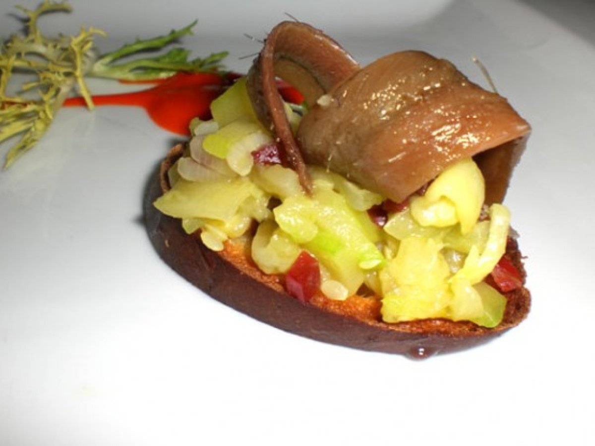 Pintxo de anchoa en salazón vota ahora PlatoFácil20 min Enviar esta receta a un amigo Imprimir esta página Preguntar al autor Publicar la foto de esta receta Ingredientes 1 Una rebanada de pan de nueces Cebolleta fresca Berenjena Jamón ibérico Queso Idiazábal Aceite de oliva virgen Anchoa en salazón