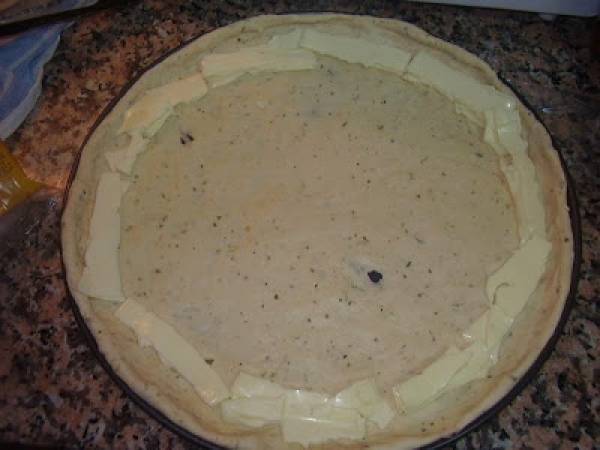 Pizza con el borde relleno de queso AnteriorSiguiente PlatoMedio1 h 40 m Enviar esta receta a un amigo Imprimir esta página Preguntar al autor Publicar la foto de esta receta Una buena piza para los finales de tarde, adiós la pizzería. Ingredientes 2 2/3 de hilacha levadura de cerveza descansada y a temperatura ambiente 1/3 de hilacha de agua 1 cucharada de aceite de oliva sabor intenso 1 1/2 hilacha de harina de repostería 1 1/2 hilacha de harina de fuerza 4 cucharadas de parmesano rallado 1 cucharada de orégano seco 1 1/2 pequeña cucharada de levadura seca de panadería Para el relleno salsa de tomate jamón cocina beicon jamón serrano aceitunas negras orégano aceite de oliva. cuatro o cinco lonchas de queso