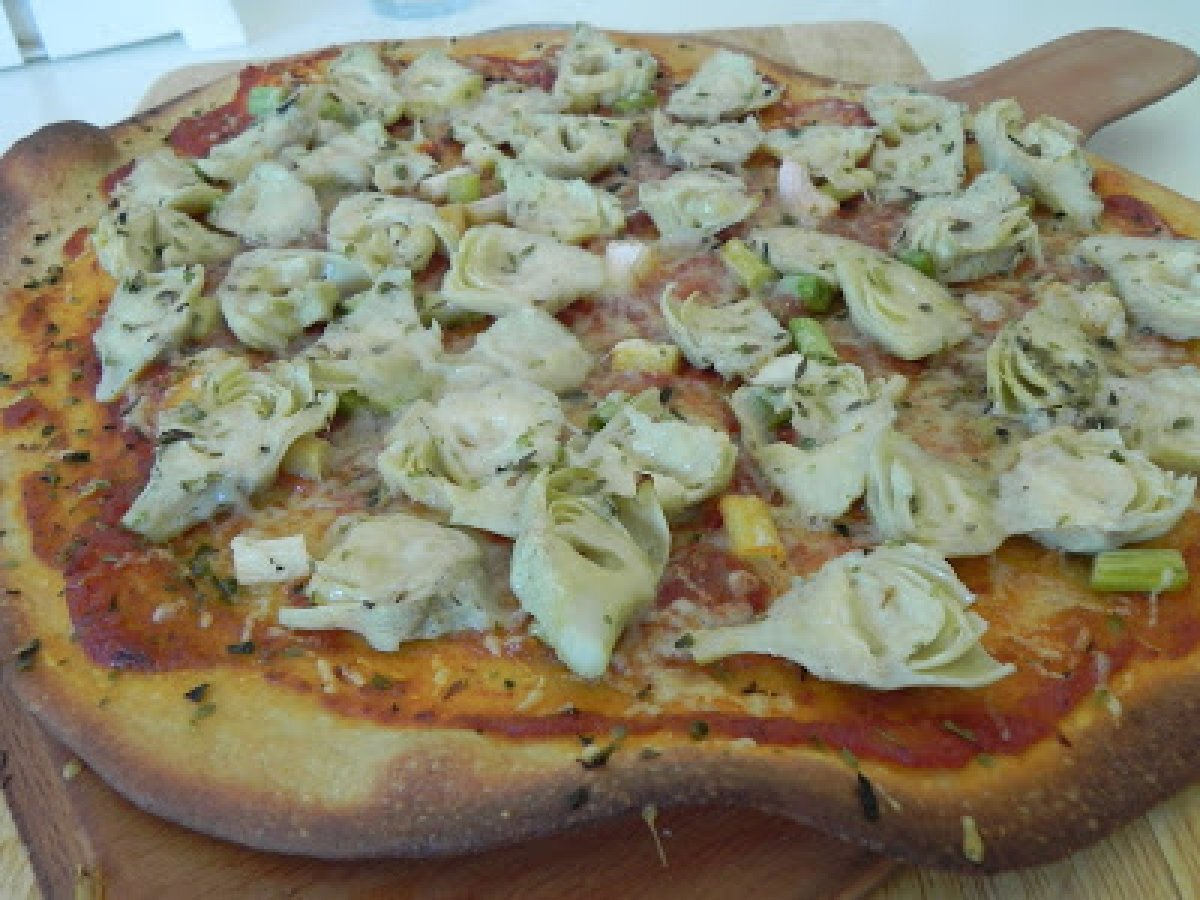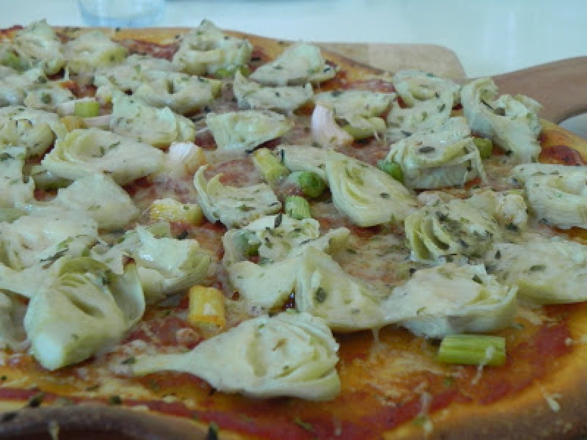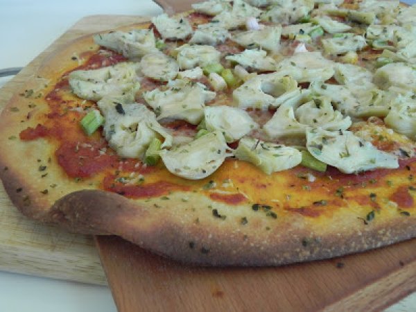 Pizza de alcachofas y ajetes vota ahora AnteriorSiguiente PlatoFácil1 h 10 m Enviar esta receta a un amigo Imprimir esta página Preguntar al autor Publicar la foto de esta receta Ingredientes 4 250 g de una masa que hacemos 200 g de harina de fuerza 50 g de harina de garbanzos 1/2 cubito de levadura fresca 1 cucharadita de jarabe de malta 2 cucharadas de aceite de oliva virgen extra 1'5 cucharaditas de sal agua 4 ajetes en trocitos de 1'5 cm 1 bote de corazones de alcachofas 50 g de grana padano rallado orégano seco aceite de oliva virgen extra