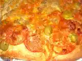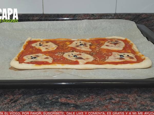 Metemos la pizza en la parte inferior del horno, que debe estar precalentado, y lo dejaremos unos 15 o 20 minutos a 200º centígrados con calor arriba y abajo.