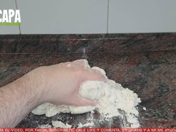 En un bol añadimos la harina, le hacemos un agujero en el centro, como si fuese un volcán, y en ese agujero añadimos la sal, el agua y 2 cucharadas de aceite de oliva. Y lo amasamos hasta conseguir una masa lisa.