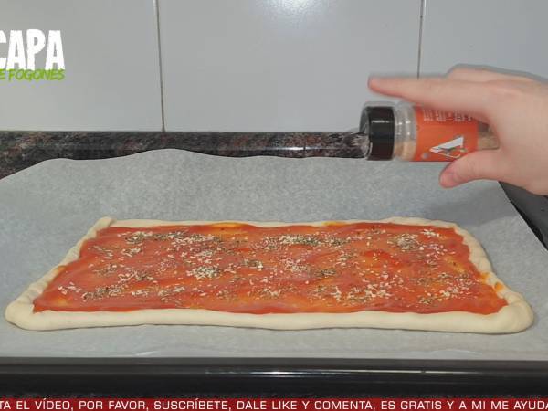 Ponemos salsa de tomate por toda la superficie de la pizza y le ponemos orégano, cebolla en polvo y ajo en polvo.