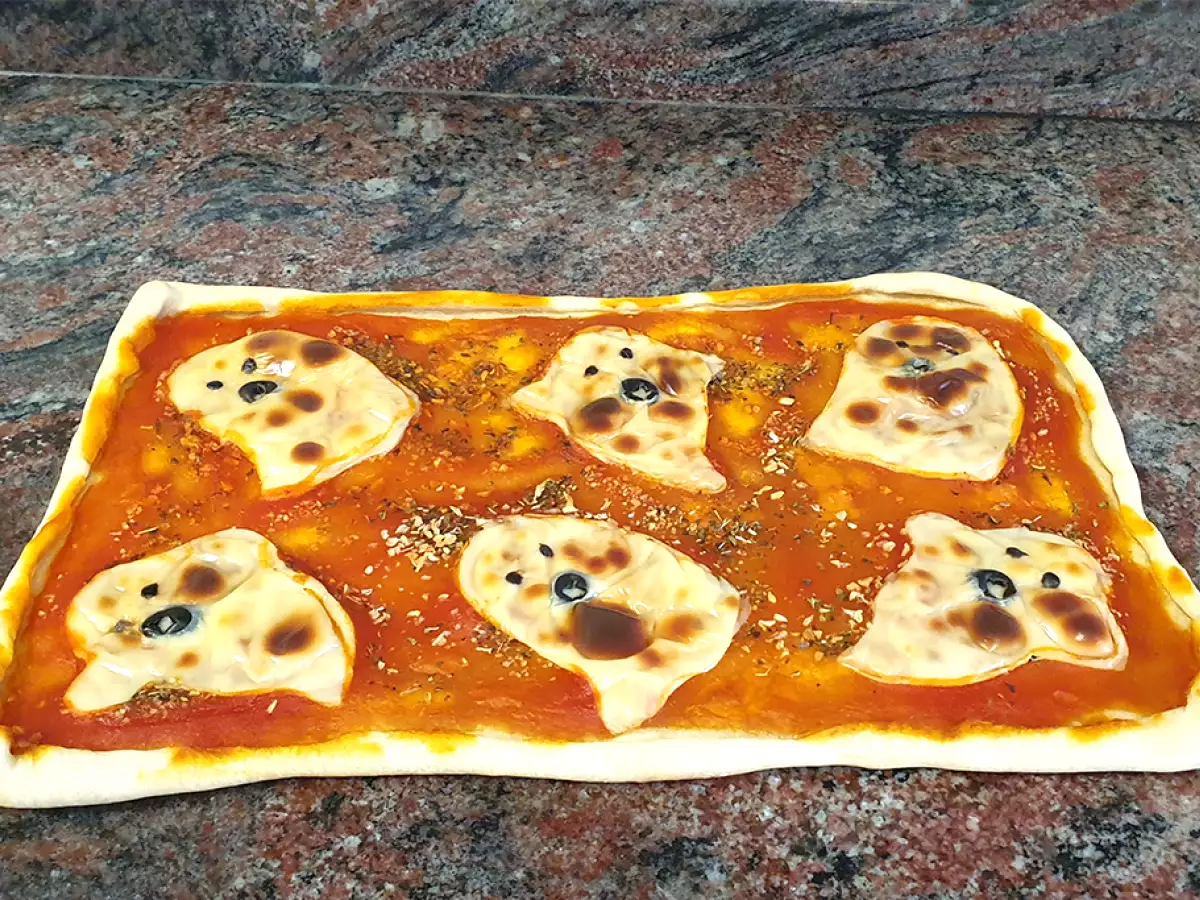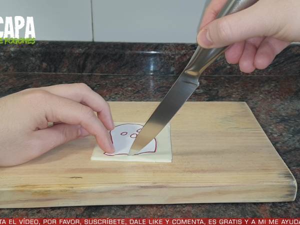 Aquí tengo unas figuras de fantasmas recortadas. Lo que haremos será poner una loncha de queso en una tabla, ponemos encima del queso la figura del fantasma y con un cuchillo recortamos la silueta del fantasma, retiramos el queso sobrante y colocamos la silueta en la pizza.