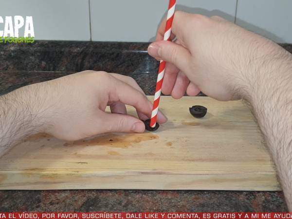 Ahora vamos a hacer los ojos a los fantasmas, para ello, cortamos una aceituna por la mitad a lo largo y con la ayuda de una pajita hacemos una presión sobre la aceituna para sacar unos pequeños círculos. Colocamos esos pequeños círculos en las siluetas de los fantasmas para simular los ojos.