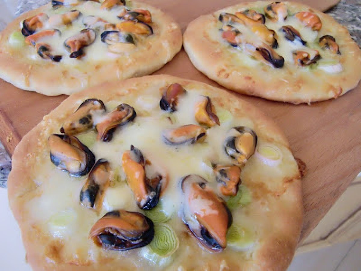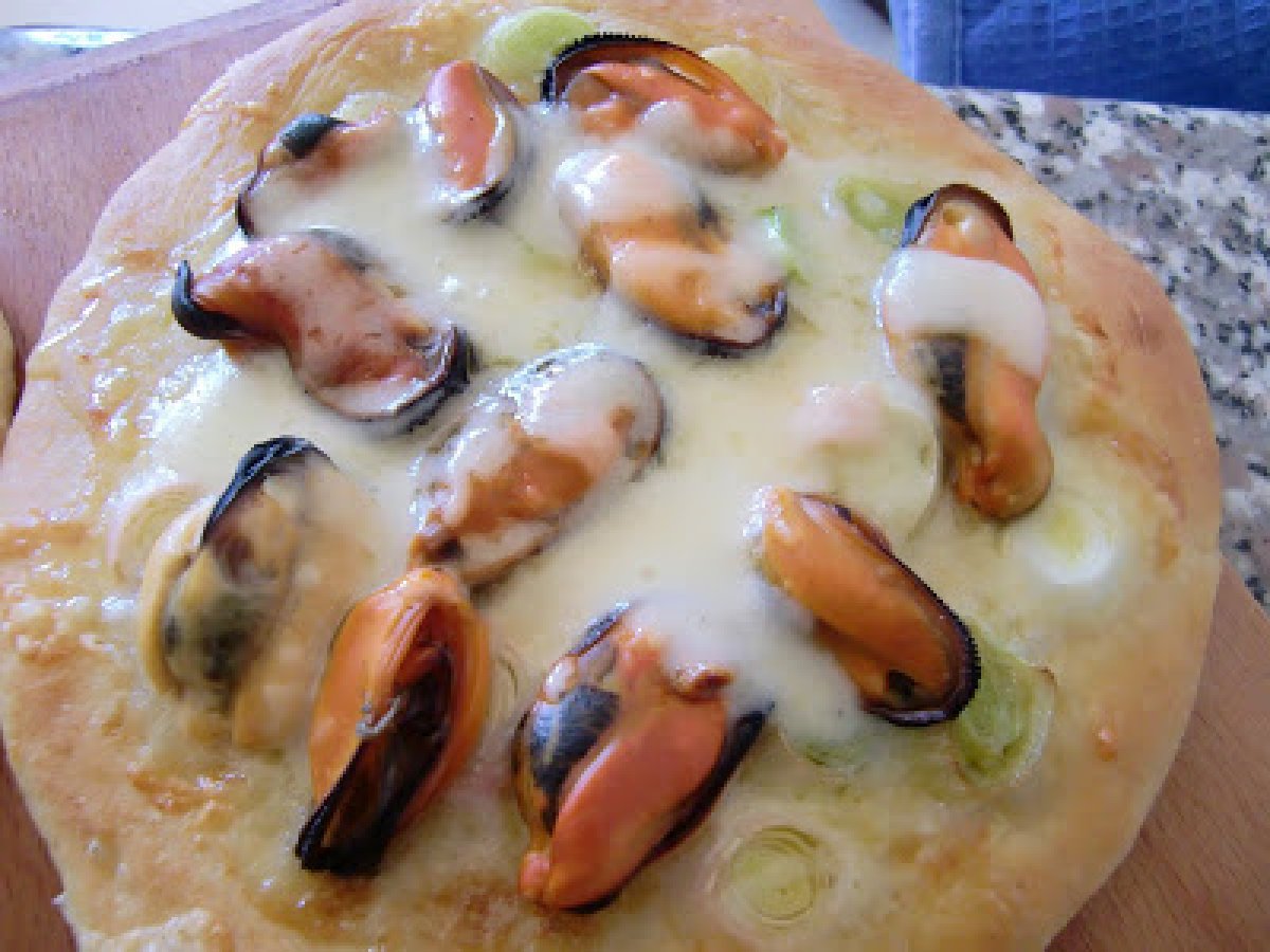 Pizza de mejillones y puerros vota ahora AnteriorSiguiente PlatoFácil30 min Enviar esta receta a un amigo Imprimir esta página Preguntar al autor Publicar la foto de esta receta Ingredientes 2 250 g de masa 2 puerros que cortamos en rodajitas de 2-3 mm aceite de oliva virgen 1 kg de mejillones 50 g gruyere rallado 60 g de mozzarella (1/2 bola) desmenuzada con las manos
