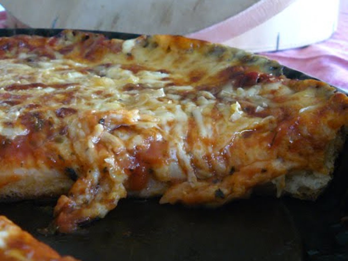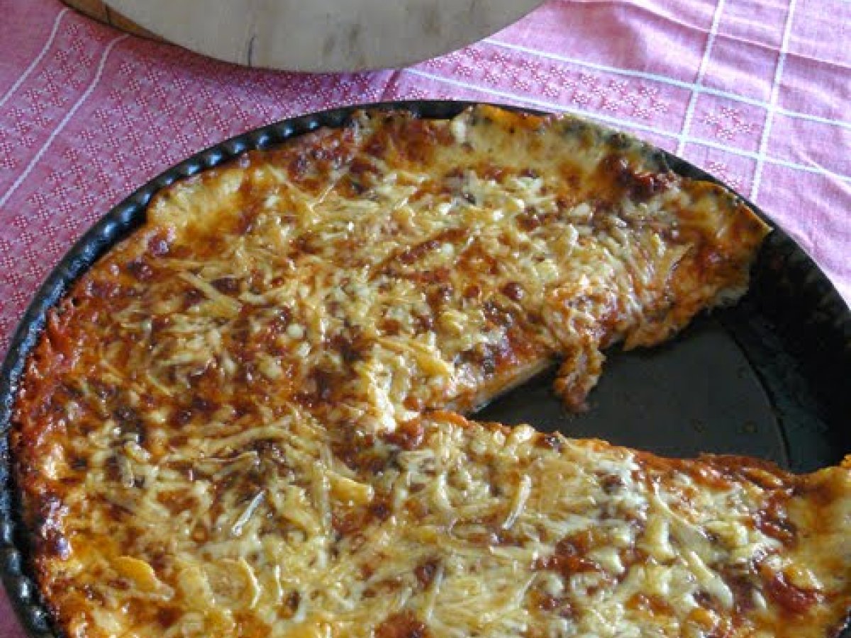 Pizza | deep dish, chicago style vota ahora AnteriorSiguiente PlatoFácil40 min Enviar esta receta a un amigo Imprimir esta página Preguntar al autor Publicar la foto de esta receta Ingredientes 2 1 pizzera profunda de alrededor de 30 cm 1 paquete (7-10 g) de levadura instantánea seca 3/4 tazas de agua tibia 1 cucharada de azúcar 1/4 taza de acite de maíz 2 1/2 tazas de harina 2 cucharadas de sal 1 cucharada de aceite de oliva Relleno: 350 g de mozzarella rallada gruesa 150 g de provolone rallado grueso 1 1/2 taza de puré de tomates, condimentados con sal, orégano y albahaca