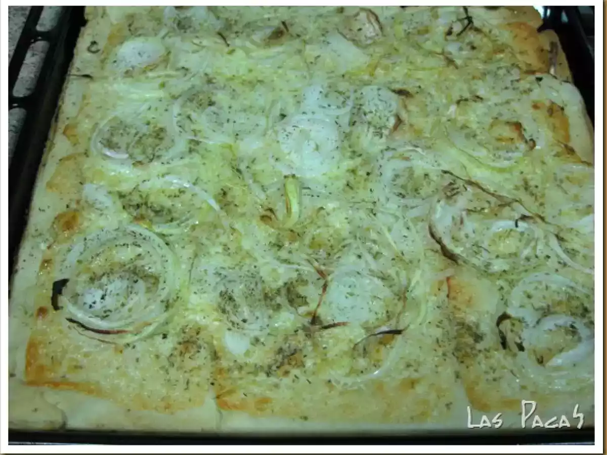 Pizza genovesa de cebolla (fugazza) (thmermomix) PlatoFácil35 min553 Kcal Enviar esta receta a un amigo Imprimir esta página Preguntar al autor Publicar la foto de esta receta Ingredientes 4 150 g de agua 20 g de aceite de oliva 10 g de levadura fresca 300 g de harina (preferiblemente mitad de fuerza y mitad normal) 1 cucharadita de sal 200 g de queso emmental rallado 2 cebollas medianas en aros finos sal y pimienta 1 cucharadita de azúcar 1 cucharadita de orégano 1 chorrito de aceite de oliva Costo estimado: 2.62Euros€ (0.66€/porción)