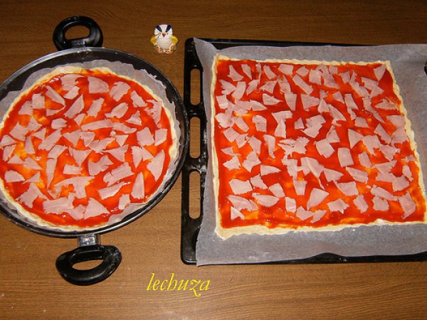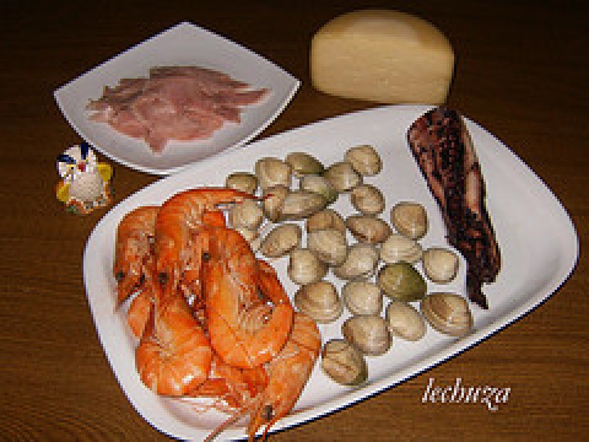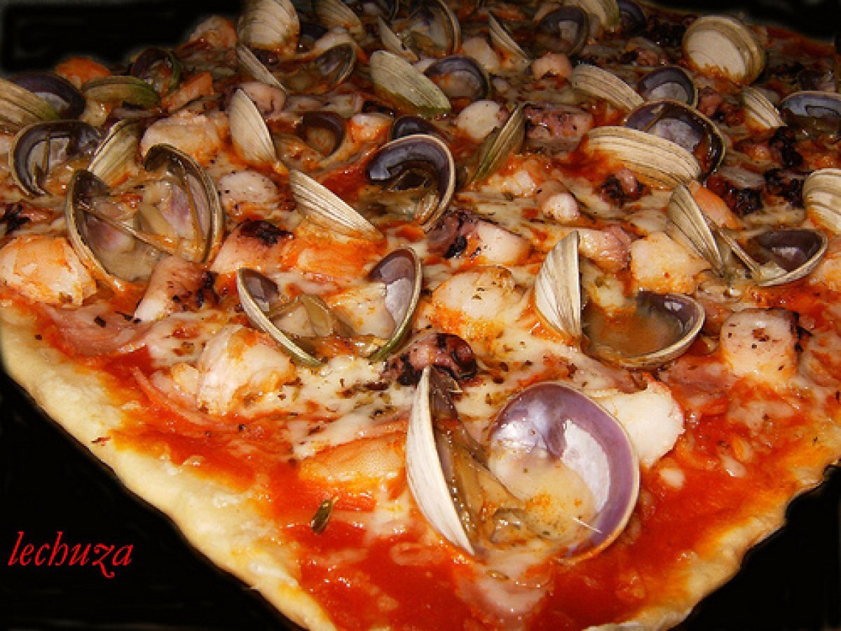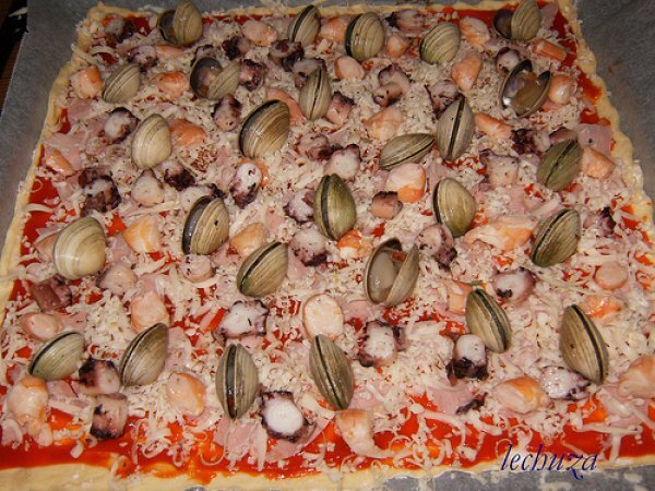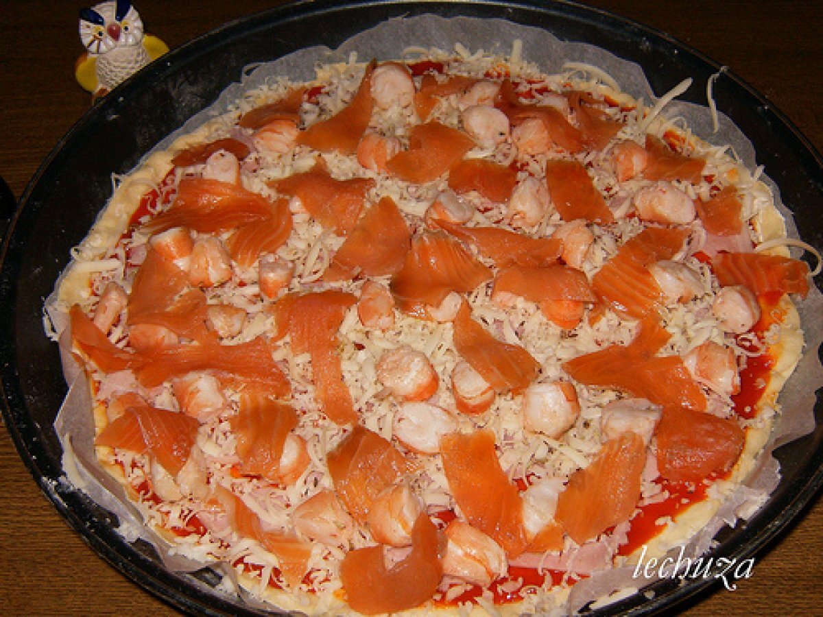 Pizzas marineras - de salmón y mariscos (receta del sr. d) AnteriorSiguiente PlatoFácil40 min Enviar esta receta a un amigo Imprimir esta página Preguntar al autor Publicar la foto de esta receta Disfrute de las vitaminas que ofrece esta receta de mariscos. Ingredientes 4 Para la masa: 500 g harina de trigo 300 ml. de agua templada 25 g levadura prensada 1/2 cucharada de sal 2 cucharadas de aceite oliva Para el relleno: un puñado de almejas 6 langostinos cocidos 2 tentáculos de pulpo (cocidos) 75 g de salmón ahumado queso rallado 5 lonchas de jamón york 10 cucharadas de salsa de tomate frito