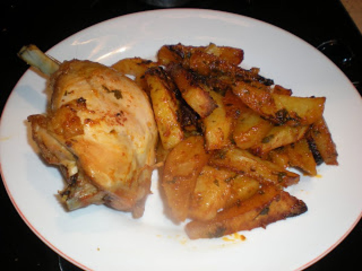 Pollo al horno con patatas sabor a pincho moruno AnteriorSiguiente PlatoFácil35 min Enviar esta receta a un amigo Imprimir esta página Preguntar al autor Publicar la foto de esta receta Ingredientes 4 1 pollo de 2 kilos troceado en trozos grandes 2 kg de patatas cortadas a lo largo ¼ de l de vino blanco 1 cuchara de aliño para pinchos morunos 1 cuchara de pimentón dulce 1 cuchara de perejil picado 1 cuchara de orégano 10 dientes de ajo entero machacado 1 cuchara de sal 1 copa de brandy 1 toque de pimienta negra