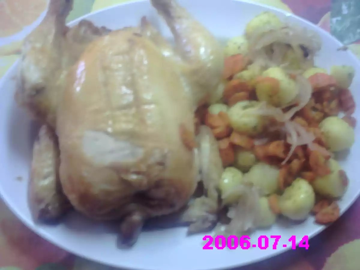 pollo asado al limón con guarnición PlatoMedio1 hora1286 Kcal Enviar esta receta a un amigo Imprimir esta página Preguntar al autor Publicar la foto de esta receta Ingredientes 1 un pollo entero, un limón,una pastilla de caldo de carne, 3 patatas medianas, media cebolla, una cucharada de margarina, perejil picado medio vaso de agua Costo estimado: 4.54Euros€ (4.54€/porción)