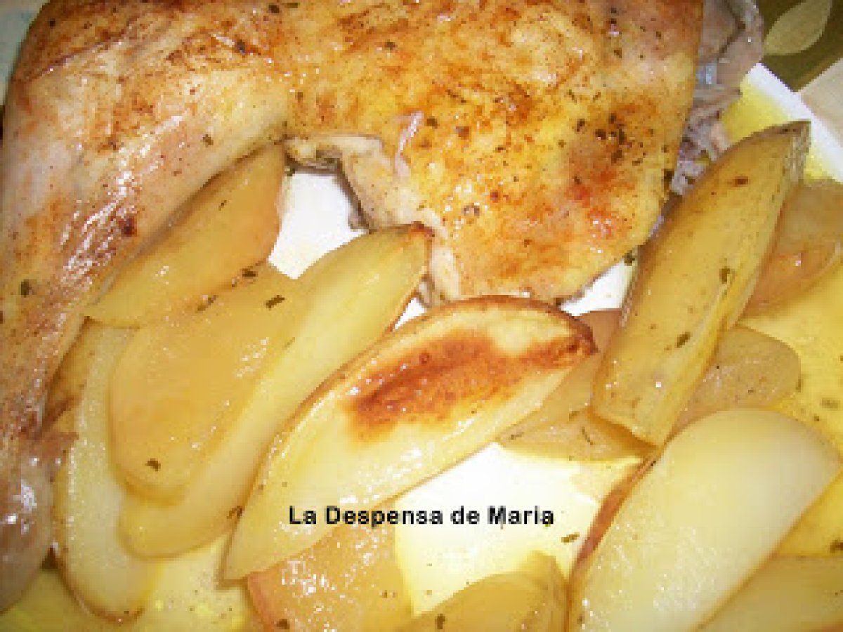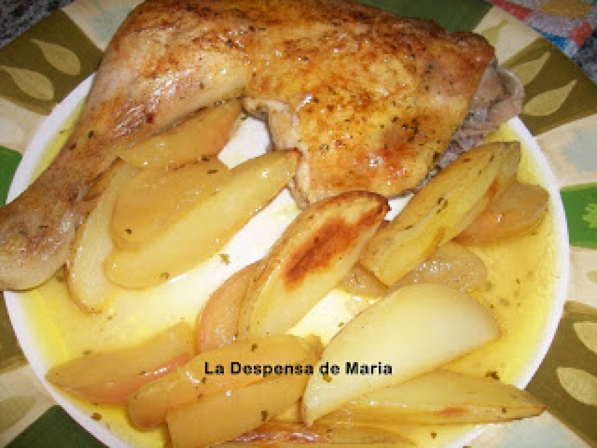 Pollo asado con manzana vota ahora AnteriorSiguiente PlatoFácil30 min Enviar esta receta a un amigo Imprimir esta página Preguntar al autor Publicar la foto de esta receta Ingredientes 2 2 muslos y sobremuslos, 2 manzanas, 2 patatas, sal, pimienta, aliño de pinchitos, perejil, aceite y 1 lata de cerveza.
