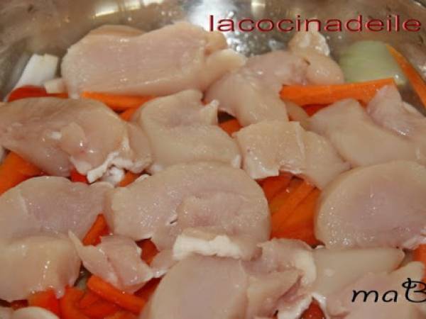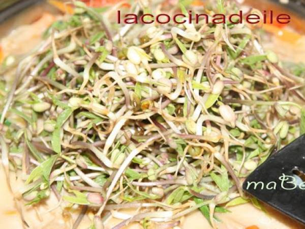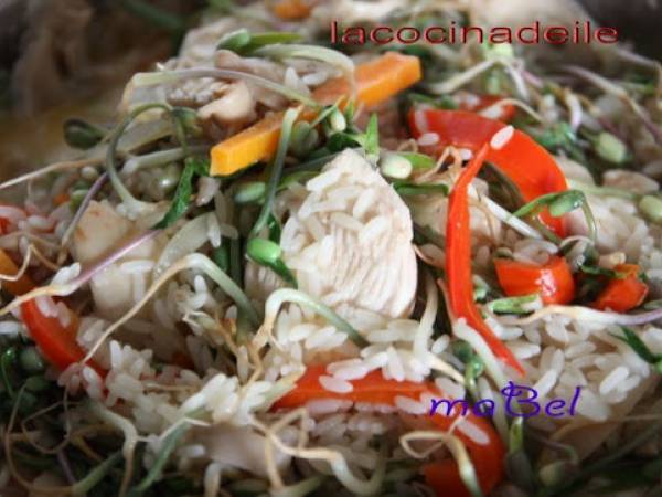 Se acuerdan que hice la germinacion de porotos de soja ? Bueno, los estoy aprovechando al maximo los brotes. Hice este pollo con los brotes, y a pedido de mi hijo, le agregue arroz, aunque a mi me gusta solo.
