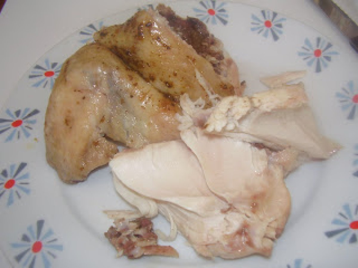 Ayer por la noche dejé un pollo adobándose en la nevera y esta mañana lo he puesto en la olla lenta. Resultado: tras siete horas de cocción un pollo jugosísimo y un caldito concentrado que sólo las prisas me han impedido aprovechar para una sopita de primer plato.