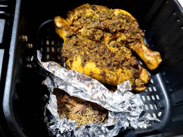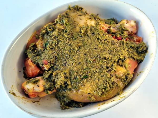Jerk es un tipo de cocina jamaicana en la que el alimento se marina toda la noche en un pasta picante. La palabra jerk viene del quechua charqui que significa carne seca. Jerk también deriva de la acción jerking, que hace referencia a hacer agujeros en la carne por los que penetre el sabor de la marinada. Y para saber más sobre el jerk, me he informado en la web The Food Lab. Originalmente este pollo se hace a la barbacoa sobre ramas de pimento (las ramas del árbol que produce las bayas de pimienta). Las ramas se empapan en agua y se ponen en paralelo sobre la hoguera. Directamente encima de las ramas se colocan las piezas de pollo marinadas cubiertas por tapaderas de metal. De este modo el pollo se cocina en una mezcla de vapor y ahumado. El aroma de las ramas de pimento le aporta al pollo un sabor muy característico. Además, al estar en contacto directo con las ramas de pimento, va impregnándose a su vez del aceite esencial de las ramas. Todo el proceso puede durar una hora, de principio a fin. Obviamente, hacer todo esto en un piso es imposible pero se puede intentar un sucedáneo. Y para dar algo de ahumado al pollo hice un paquete con hojas de laurel, pimienta de Jamaica, romero y tomillo. Yo sólo utilicé 2 cuartos traseros de pollo y ajusté los ingredientes.
