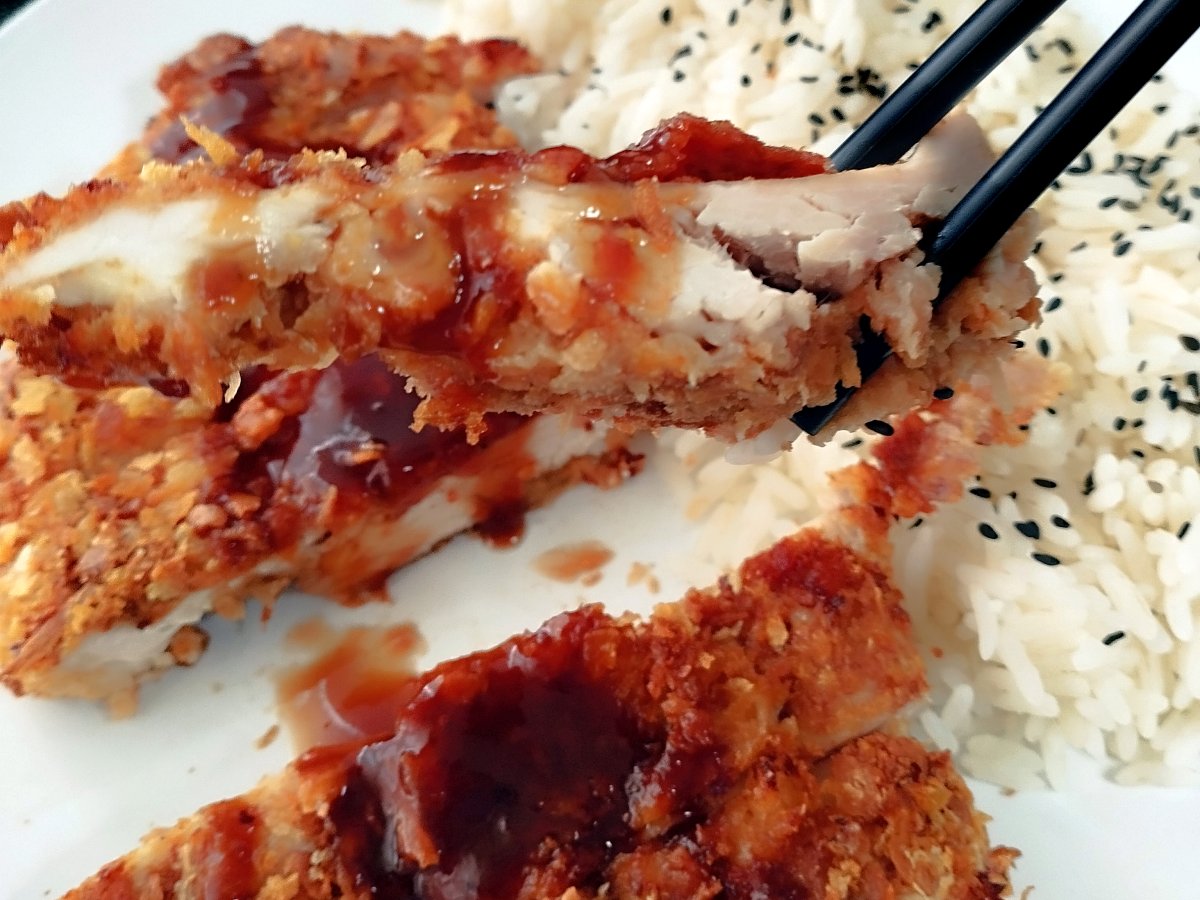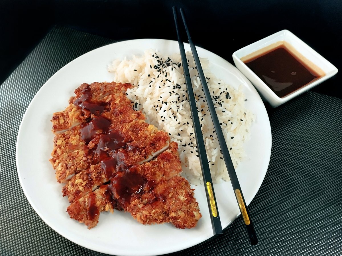 El término "Katsu" en japonés no tiene nada que ver con una cuestión gastronómica es más bien una creencia. Significa "ganar", "triunfar", "ser exitoso" o "superar adversidades". En Japón, antes de hacer un examen o de participar en alguna competición es tradición comer cualquier variante de katsu: tonkatsu (versión con cerdo), katsudon... vamos, que es una receta de ganadores!!. Pero según otros el término katsu es la forma abreviada de katsuretsu que significa "chuleta". Qué lío ¿no? ¿a quien hacer caso? Pollo katsu es un tipo de yõshoku: versión japonesa de comida occidental. Y entre estas comidas versionadas también está el curry japonés del que me declaro fan. Originalmente se hacía frito, luego se aligeró preparándolo en el horno y finalmente llegó a nuestras vidas la freidora de aire!! Sea como sea necesitarás panko, el pan rallado japonés pero más ligero y crujiente. No está elaborado con pan como pueda pensarse. Se hace con harina de trigo y un proceso de extrusión y cribado. Una vez tratado se seca en turbinas de aire caliente. El panko permite rebozados más ligeros ya que no absorbe tanto aceite, el empanado queda crujiente. Se compra en tiendas asiáticas aunque creo que ya lo tienen en supermercados tipo Alcampo. NO utilices pan rallado, no tiene nada que ver. Y una vez rebozado y cocinado se corta en tiras para facilitar comerlos con palillos y napado con salsa tonkatsu, una versión más espesa que la Salsa Worcestershire. Puedes comprarla o hacerla en casa siempre y cuando seas un cocinillas y tengas habitualmente mil quinientos ingredientes en casa. Si no es así, cómprala en tiendas asiáticas. Yo afortunadamente los tengo. Todo el mundo dice que es muy rápido de hacer. Y ya te digo yo que no: entre tostar el panko, cortar las pechugas y empanarlas... se te va bastante tiempo.
