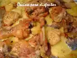 Pollo y patatas al horno de convección PlatoFácil50 min360 Kcal Enviar esta receta a un amigo Imprimir esta página Preguntar al autor Publicar la foto de esta receta Ingredientes 4 1 pollo a cuartos patatas 1 limón a rodajas 2 dientes de ajo pimienta aceite y sal Costo estimado: 5.21Euros€ (1.3€/porción)