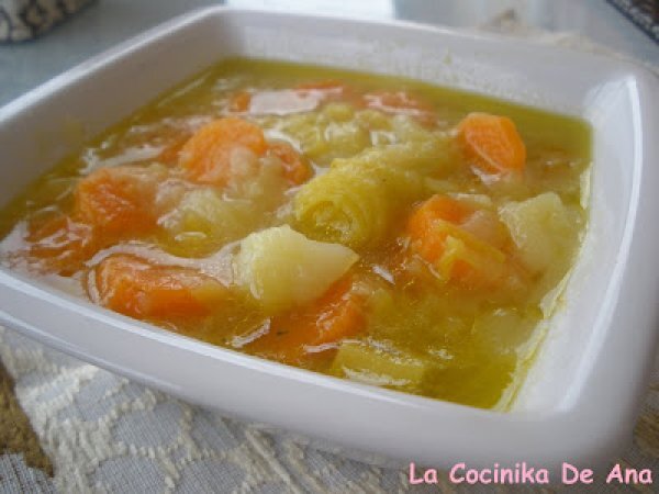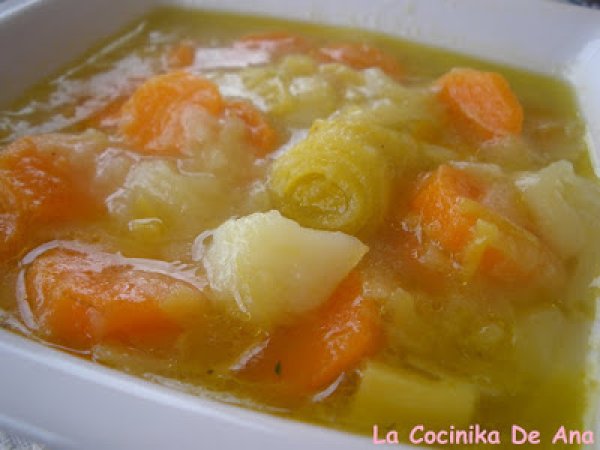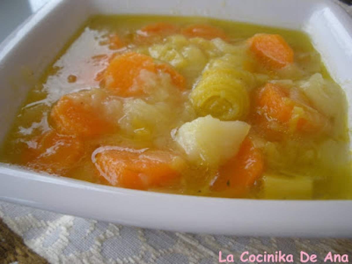 - Poner en una olla los puerros con el agua y dejar hacer. A los 20 minutos añafirles las patatas y zanahorias y por último la sal y pimienta, que deberan estar hasta que esten blandas, cocinar otros minutillos y añadirle el aceite de oliva, en los últimos dos minutos y tomar caliente.