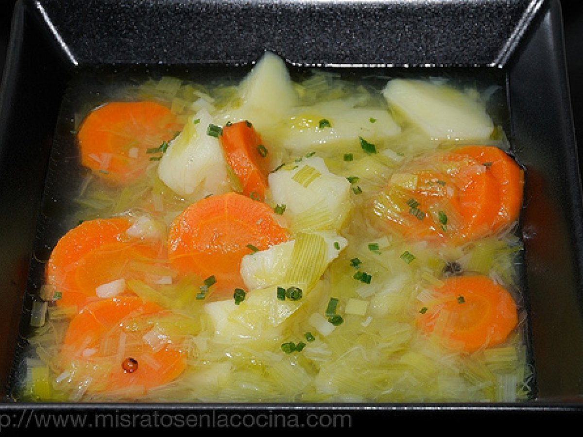 Porrusalda (thermomix) PlatoFácil35 min442 Kcal Enviar esta receta a un amigo Imprimir esta página Preguntar al autor Publicar la foto de esta receta Ingredientes 2 1 l de agua 300 g de puerros 300 g de papas 180 g de zanahorias 50 g de aceite de oliva virgen extra Sal Pimienta Costo estimado: 2.02Euros€ (1.01€/porción)