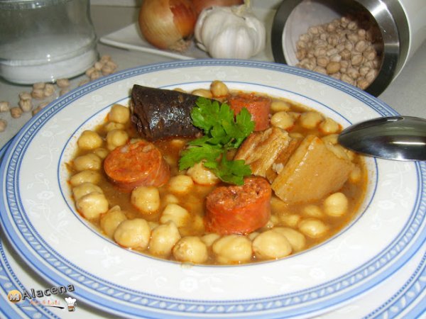 Potaje de garbanzos (cocido lebaniego) PlatoFácil55 min Enviar esta receta a un amigo Imprimir esta página Preguntar al autor Publicar la foto de esta receta Ingredientes 4 1/2 kg de garbanzos 1 morcilla fresca 2 chorizos 1 tira gruesa de tocino de veta 1 cabeza de ajos 1 hoja de laurel 1 cebolla una puntilla de pimienta negra una puntilla de pimentón ahumado una puntilla de cominos molidos unas hebra de azafrán agua sal