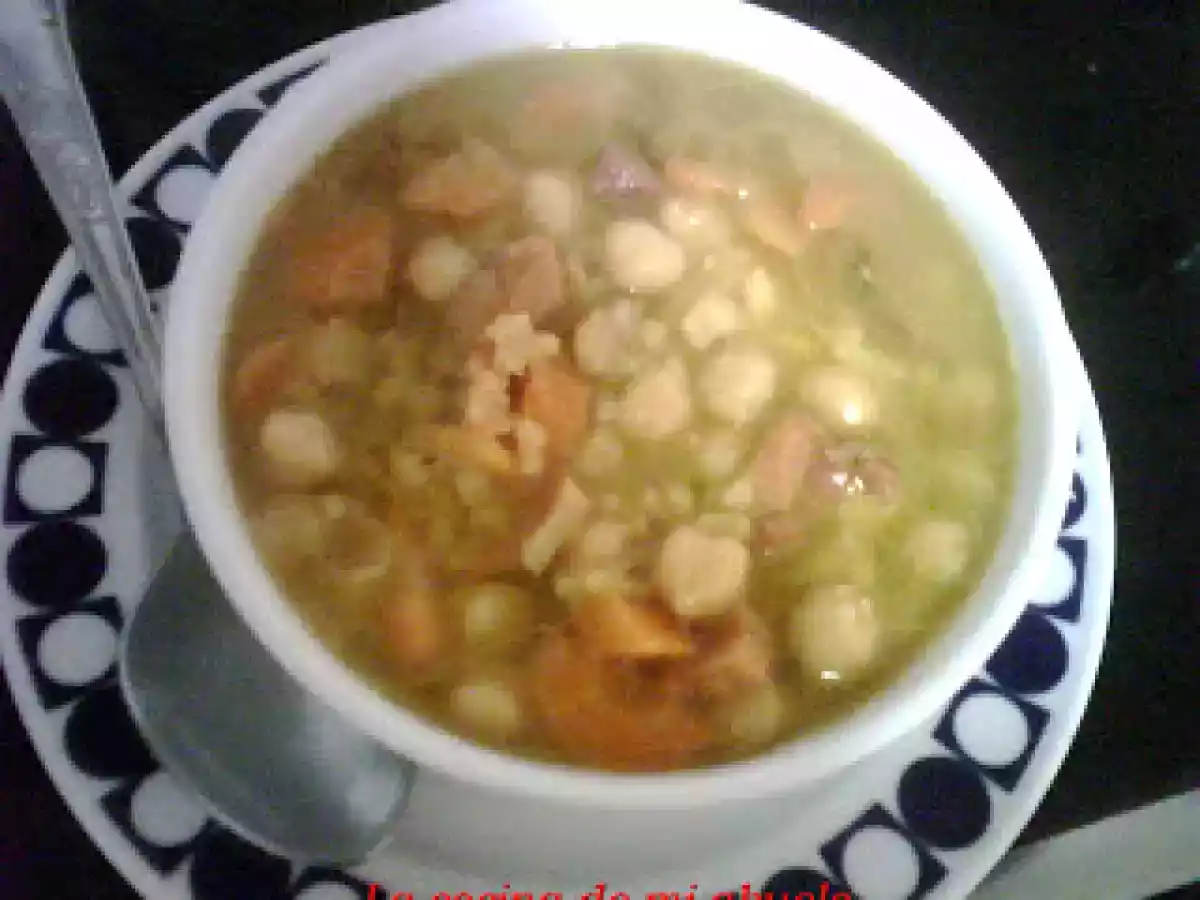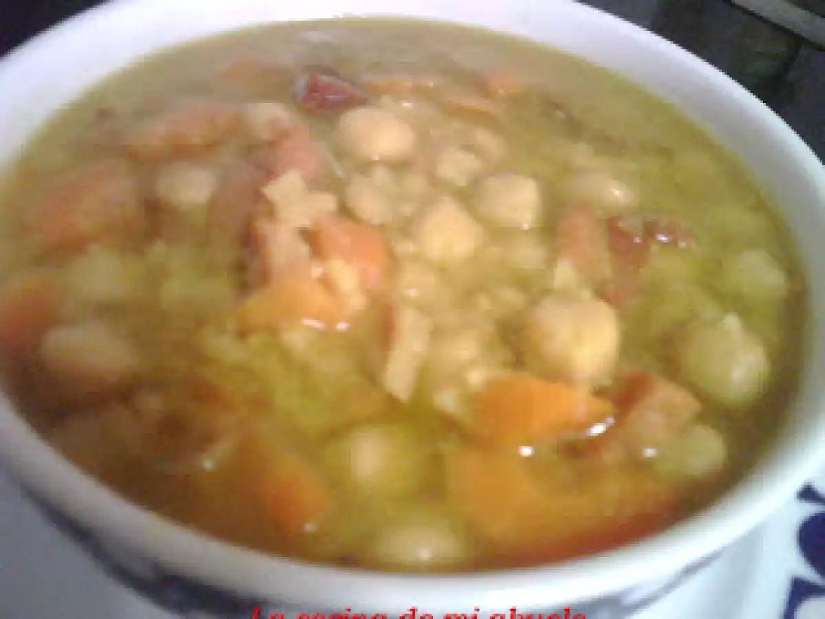 Potaje rápido de garbanzos y arroz. vota ahora AnteriorSiguiente PlatoFácil1 hora309 Kcal Enviar esta receta a un amigo Imprimir esta página Preguntar al autor Publicar la foto de esta receta Ingredientes 4 250 g de garbanzos castellanos cocidos 80 g de arroz de grano redondo 2 zanahorias 150 g de jamón cortado en tacos 1 cebolla 2 dientes de ajo 2 cucharas de comino sal 1 hoja de laurel colorante alimenticio o azafrán aceite de oliva Costo estimado: 8.61Euros€ (2.15€/porción)
