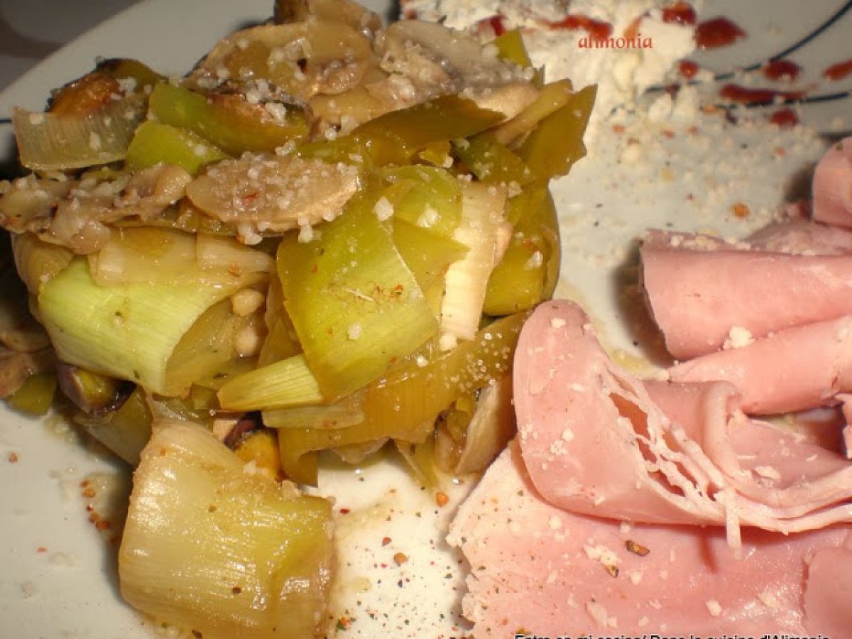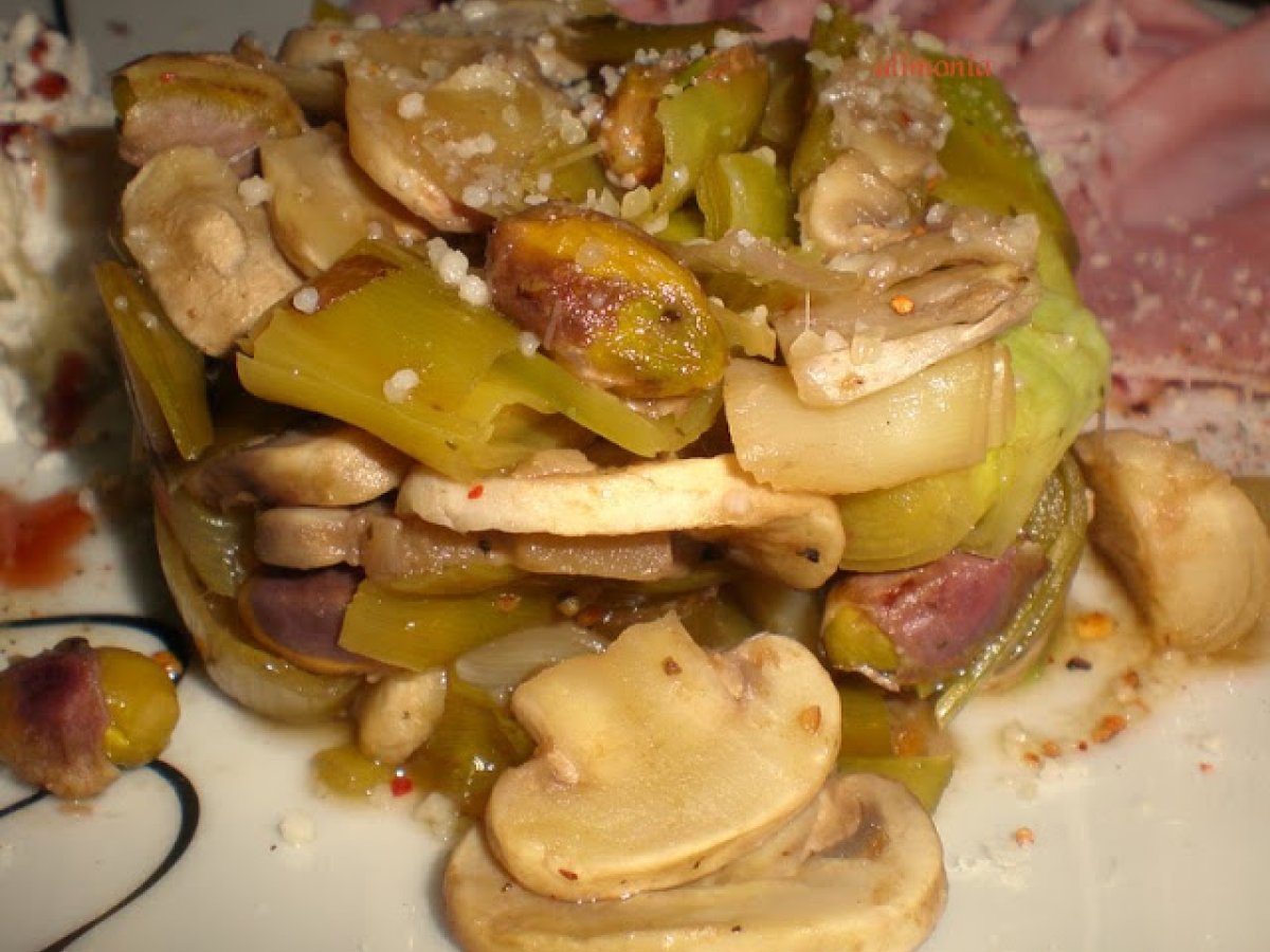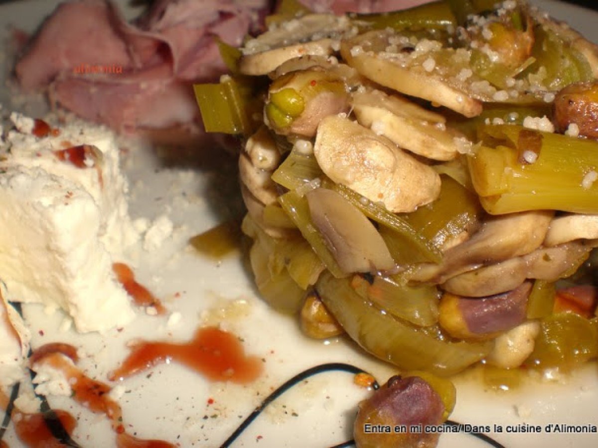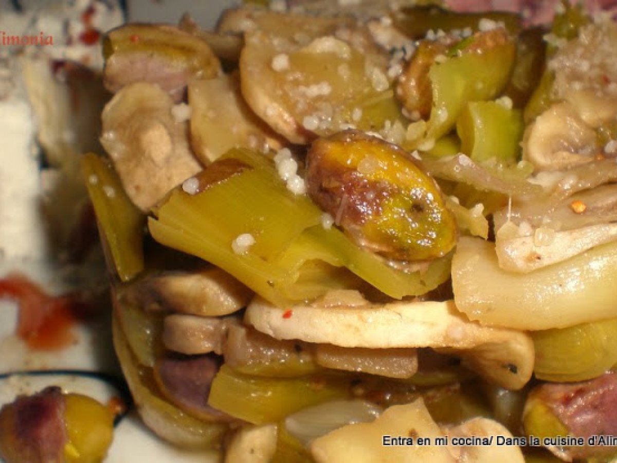 Puerros a la miel AnteriorSiguiente PlatoFácil35 min231 Kcal Enviar esta receta a un amigo Imprimir esta página Preguntar al autor Publicar la foto de esta receta Ingredientes 4 8 puerros 150 g de champiñones en laminas 200 ml de vino de Malaga 3 c.soupe de miel liquida sal pimienta pistachos sin sal parmesano rallado Costo estimado: 5.77Euros€ (1.44€/porción)